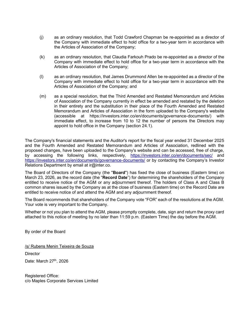 (j) as an ordinary resolution, that Todd Crawford Chapman be re-appointed as a director of the Company with immediate effect to hold office for a two-year term in accordance with the Articles of Association of the Company; (k) as an ordinary resolution, that Claudia Farkouh Prado be re-appointed as a director of the Company with immediate effect to hold office for a two-year term in accordance with the Articles of Association of the Company; (l) as an ordinary resolution, that James Drummond Allen be re-appointed as a director of the Company with immediate effect to hold office for a two-year term in accordance with the Articles of Association of the Company; and (m) as a special resolution, that the Third Amended and Restated Memorandum and Articles of Association of the Company currently in effect be amended and restated by the deletion in their entirety and the substitution in their place of the Fourth Amended and Restated Memorandum and Articles of Association in the form uploaded to the Company's website (accessible at https://investors.inter.co/en/documents/governance-documents/) with immediate effect, to increase from 10 to 12 the number of persons the Directors may appoint to hold office in the Company (section 24.1). The Company's financial statements and the Auditor's report for the fiscal year ended 31 December 2025 and the Fourth Amended and Restated Memorandum and Articles of Association, redlined with the proposed changes, have been uploaded to the Company's website and can be accessed, free of charge, by accessing the following links, respectively, https://investors.inter.co/en/documents/sec/ and https://investors.inter.co/en/documents/governance-documents/ or by contacting the Company’s Investor Relations Department by email at ir@inter.co. The Board of Directors of the Company (the "Board") has fixed the close of business (Eastern time) on March 23, 2026, as the record date (the “Record Date”) for determining the shareholders of the Company entitled to receive notice of the AGM or any adjournment thereof. The holders of Class A and Class B common shares issued by the Company as at the close of business (Eastern time) on the Record Date are entitled to receive notice of and attend the AGM and any adjournment thereof. The Board recommends that shareholders of the Company vote “FOR” each of the resolutions at the AGM. Your vote is very important to the Company. Whether or not you plan to attend the AGM, please promptly complete, date, sign and return the proxy card attached to this notice of meeting by no later than 11:59 p.m. (Eastern Time) the day before the AGM. By order of the Board /s/ Rubens Menin Teixeira de Souza Director Date: March 27th, 2026 Registered Office: c/o Maples Corporate Services Limited