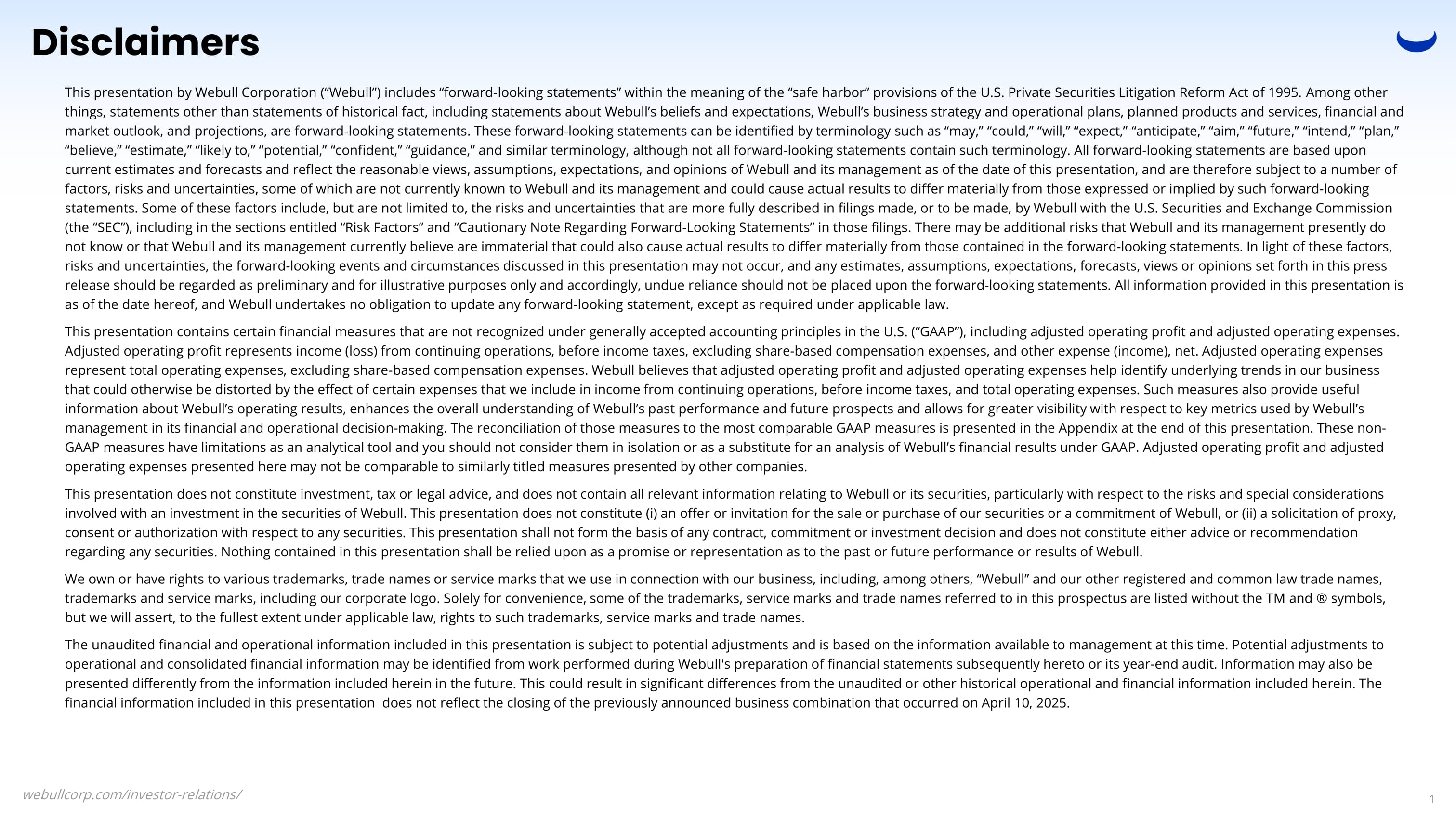 This presentation by Webull Corporation (“Webull”) includes “forward - looking statements” within the meaning of the “safe harbor” provisions of the U.S. Private Securities Litigation Reform Act of 1995. Among other things, statements other than statements of historical fact, including statements about Webull’s beliefs and expectations, Webull’s business strategy and operational plans, planned products and services, financial and market outlook, and projections, are forward - looking statements. These forward - looking statements can be identified by terminolo gy such as “may,” “could,” “will,” “expect,” “anticipate,” “aim,” “future,” “intend,” “plan,” “believe,” “estimate,” “likely to,” “potential,” “confident,” “guidance,” and similar terminology, although not all forward - look ing statements contain such terminology. All forward - looking statements are based upon current estimates and forecasts and reflect the reasonable views, assumptions, expectations, and opinions of Webull and its m ana gement as of the date of this presentation, and are therefore subject to a number of factors, risks and uncertainties, some of which are not currently known to Webull and its management and could cause actual r esu lts to differ materially from those expressed or implied by such forward - looking statements. Some of these factors include, but are not limited to, the risks and uncertainties that are more fully described in filings made, or to be made, by Webull with the U.S. Securities and Exchange Commission (the “SEC”), including in the sections entitled “Risk Factors” and “Cautionary Note Regarding Forward - Looking Statements” in those filings. There may be additional risks that Webull and its management presently do not know or that Webull and its management currently believe are immaterial that could also cause actual results to differ ma ter ially from those contained in the forward - looking statements. In light of these factors, risks and uncertainties, the forward - looking events and circumstances discussed in this presentation may not occur, and any esti mates, assumptions, expectations, forecasts, views or opinions set forth in this press release should be regarded as preliminary and for illustrative purposes only and accordingly, undue reliance should not be pl ace d upon the forward - looking statements. All information provided in this presentation is as of the date hereof, and Webull undertakes no obligation to update any forward - looking statement, except as required under app licable law. This presentation contains certain financial measures that are not recognized under generally accepted accounting principles in the U.S. (“GAAP”), including adjusted operating profit and adjusted operating expenses. Adjusted operating profit represents income (loss) from continuing operations, before income taxes, excluding share - based compen sation expenses, and other expense (income), net. Adjusted operating expenses represent total operating expenses, excluding share - based compensation expenses. Webull believes that adjusted operating profit and adjusted operating expenses help identify underlying trends in our business that could otherwise be distorted by the effect of certain expenses that we include in income from continuing operations, bef ore income taxes, and total operating expenses. Such measures also provide useful information about Webull’s operating results, enhances the overall understanding of Webull’s past performance and future prospects and allows for greater visibility with respect to key metrics used by Webull’s management in its financial and operational decision - making. The reconciliation of those measures to the most comparable GAAP me asures is presented in the Appendix at the end of this presentation. These non - GAAP measures have limitations as an analytical tool and you should not consider them in isolation or as a substitute for an ana lysis of Webull’s financial results under GAAP. Adjusted operating profit and adjusted operating expenses presented here may not be comparable to similarly titled measures presented by other companies. This presentation does not constitute investment, tax or legal advice, and does not contain all relevant information relating to Webull or its securities, particularly with respect to the risks and special considerations involved with an investment in the securities of Webull. This presentation does not constitute ( i ) an offer or invitation for the sale or purchase of our securities or a commitment of Webull, or (ii) a solicitation of prox y, consent or authorization with respect to any securities. This presentation shall not form the basis of any contract, commitme nt or investment decision and does not constitute either advice or recommendation regarding any securities. Nothing contained in this presentation shall be relied upon as a promise or representation as to th e p ast or future performance or results of Webull. We own or have rights to various trademarks, trade names or service marks that we use in connection with our business, includ ing , among others, “Webull” and our other registered and common law trade names, trademarks and service marks, including our corporate logo. Solely for convenience, some of the trademarks, service marks and tr ade names referred to in this prospectus are listed without the TM and ® symbols, but we will assert, to the fullest extent under applicable law, rights to such trademarks, service marks and trade names. The unaudited financial and operational information included in this presentation is subject to potential adjustments and is bas ed on the information available to management at this time. Potential adjustments to operational and consolidated financial information may be identified from work performed during Webull's preparation of financial statements subsequently hereto or i