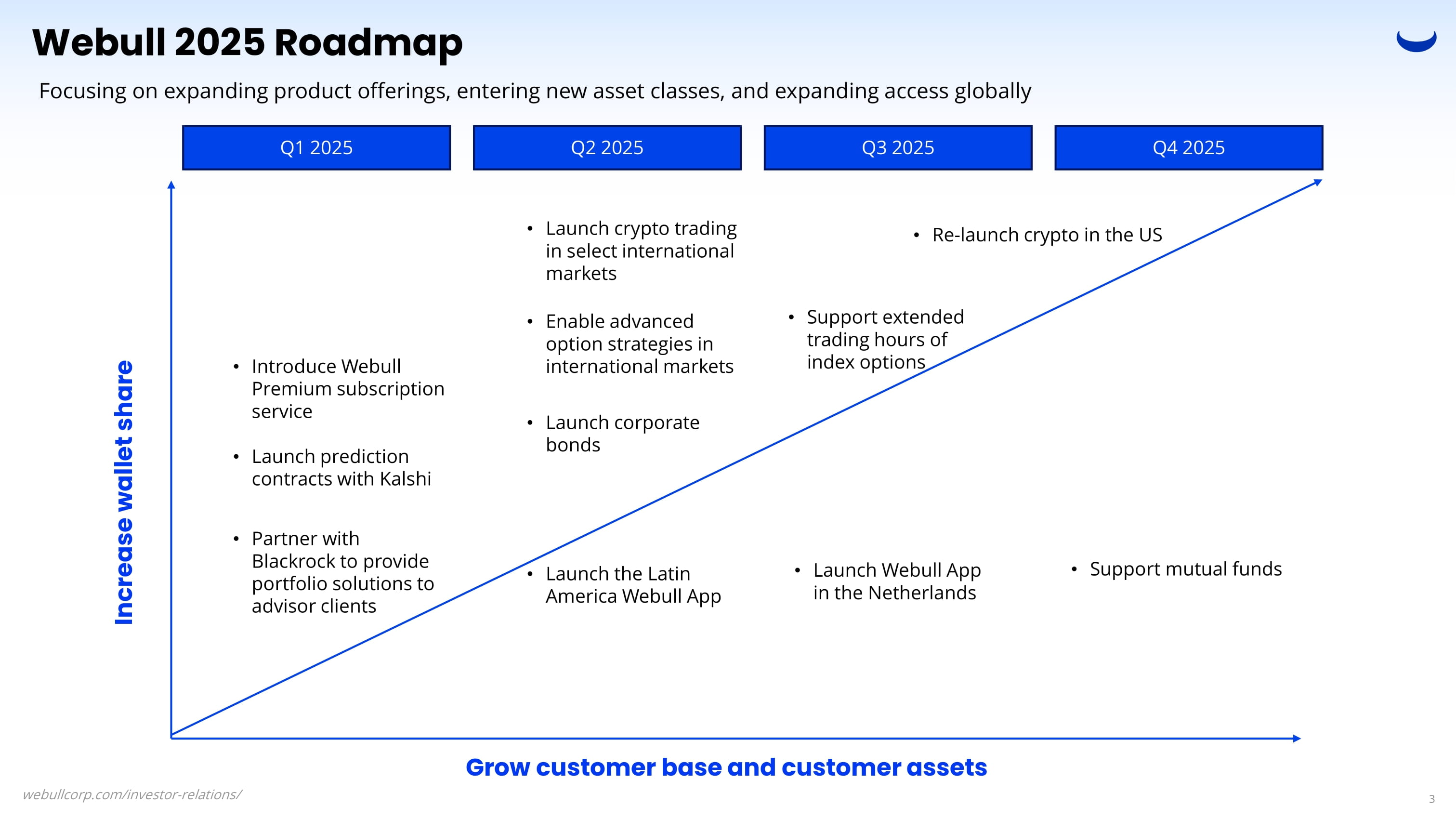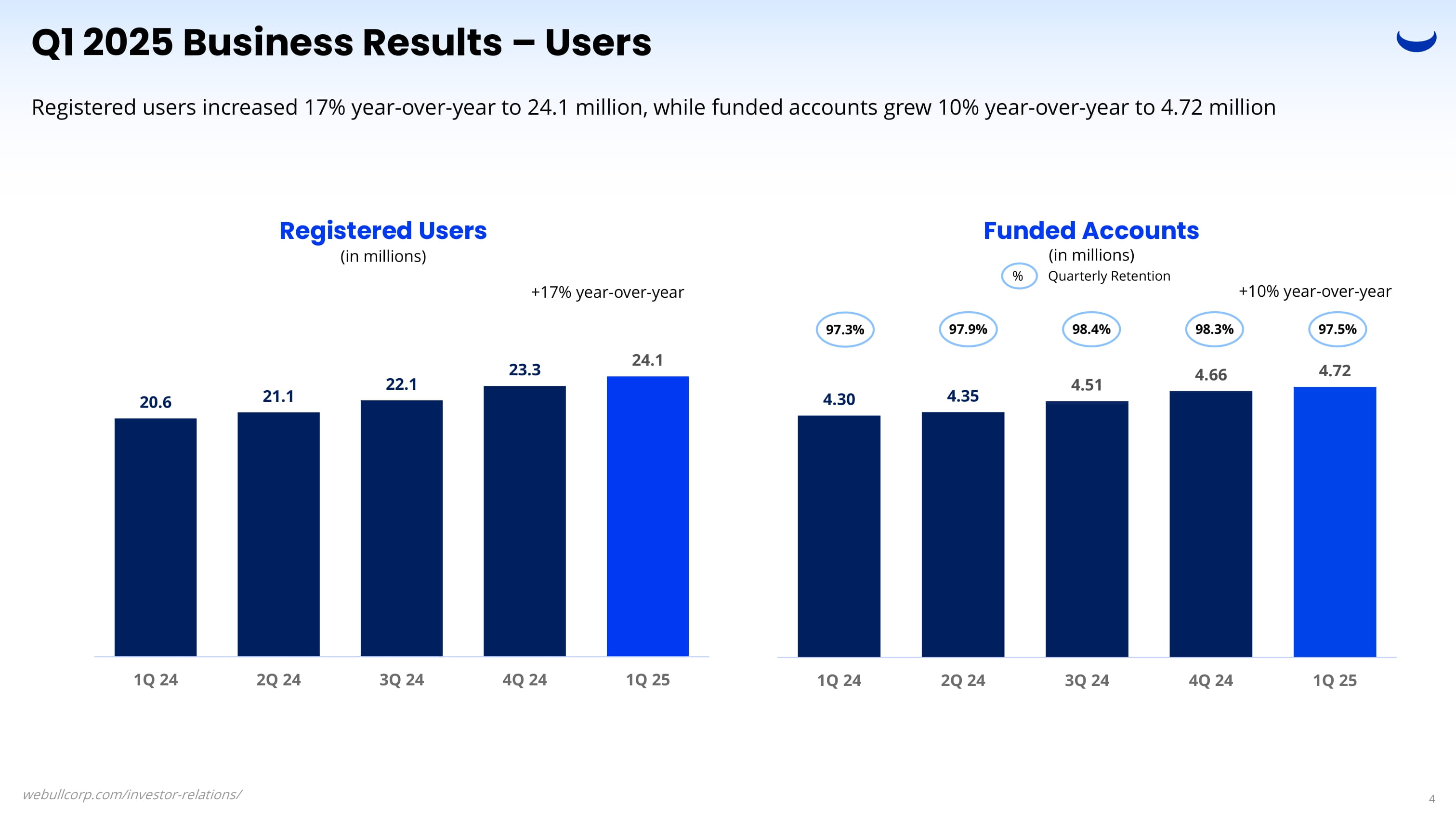 Total Revenues ($ in millions) Q1 2025 Highlights 2 Adj. Operating Expense webullcorp.com/investor - relations/ Adjusted Operating Expense and Adjusted Operating profit are non - GAAP financial measures. Refer to the Appendix for the reconci liations of Adjusted Operating Expense and Adjusted Operating Profit to their most directly comparable GAAP measures, total o per ating expenses and (loss) income before income taxes, respectively. 88.9 117.4 0.0 20.0 40.0 60.0 80.0 100.0 120.0 Q1 2024 Q1 2025 +32% ($ in millions) 86.6 88.7 0.0 20.0 40.0 60.0 80.0 100.0 120.0 Q1 2024 Q1 2025 +2.4% Adj. Operating Profit ($ in millions) 2.3 28.7 0.0 20.0 40.0 60.0 80.0 100.0 120.0 Q1 2024 Q1 2025 2.6% 24.4% +22 pts operating profit margin improvement over Q1 last year Strong top line growth with stable opex leading to significant profit margin improvement