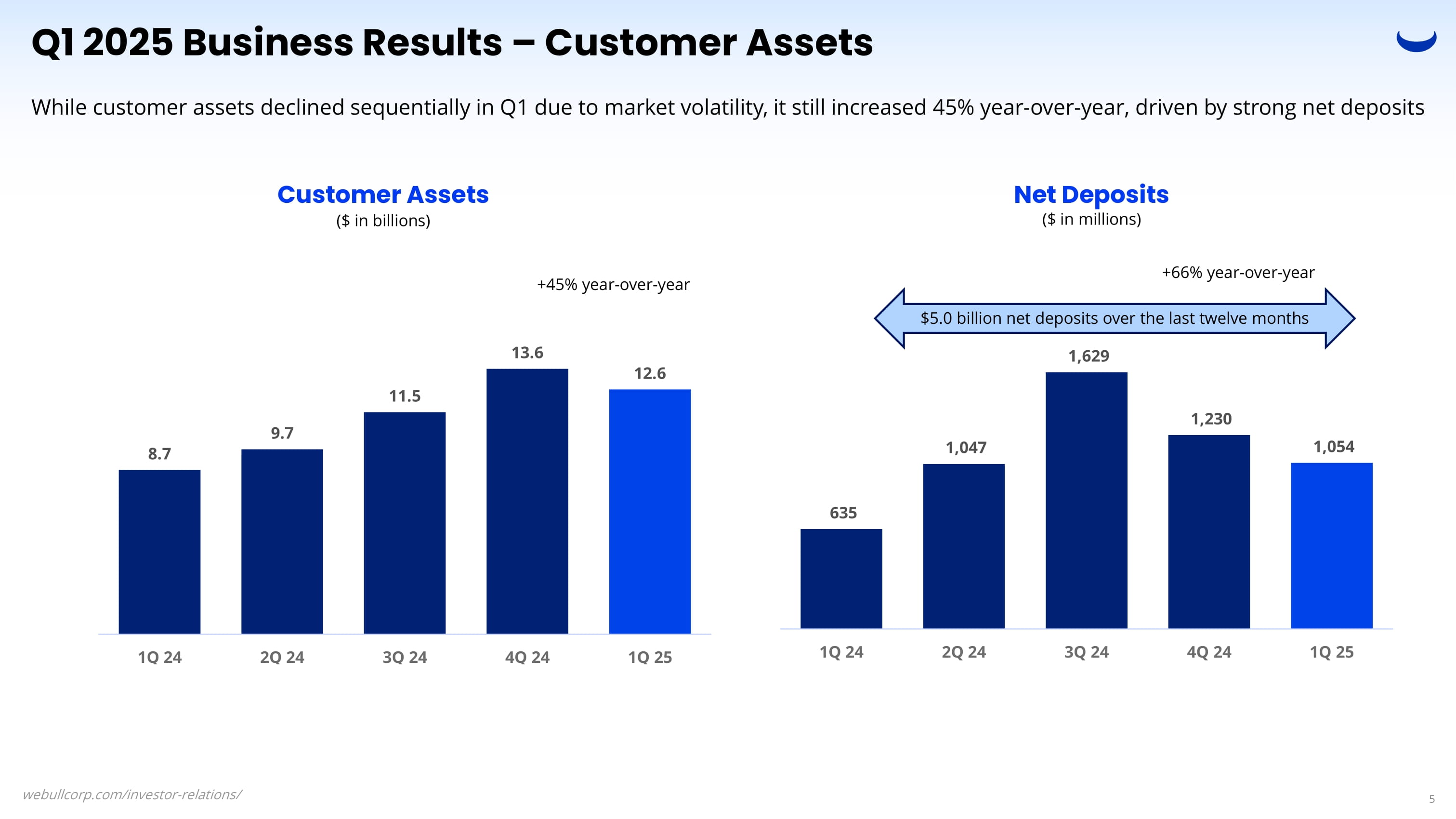 97.3% 97.9% 98.4% Q1 2025 Business Results – Users 4 Funded Accounts (in millions ) Registered Users (in millions ) % Quarterly Retention webullcorp.com/investor - relations/ 98.3% 20.6 21.1 22.1 23.3 24.1 1Q 24 2Q 24 3Q 24 4Q 24 1Q 25 4.30 4.35 4.51 4.66 4.72 1Q 24 2Q 24 3Q 24 4Q 24 1Q 25 97.5% +17% year - over - year +10% year - over - year Registered users increased 17% year - over - year to 24.1 million, while funded accounts grew 10% year - over - year to 4.72 million