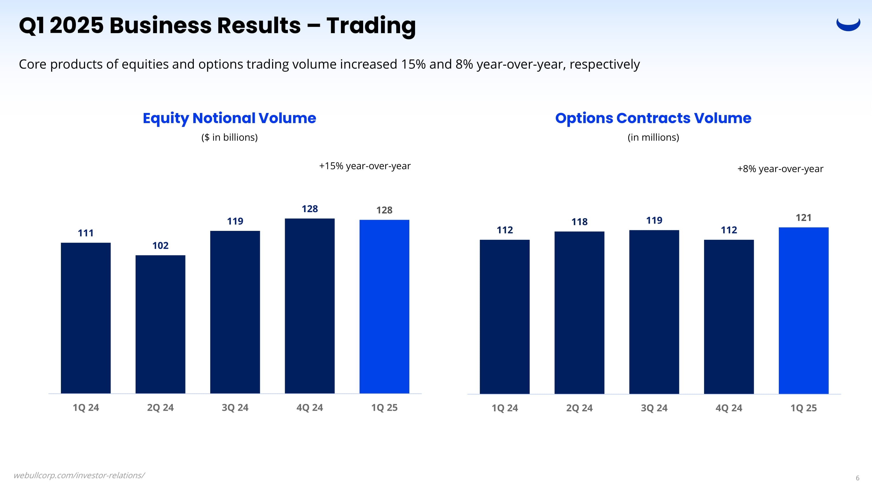 Q1 2025 Business Results – Customer Assets 5 Net Deposits ($ in millions ) Customer Assets ($ in billions ) webullcorp.com/investor - relations/ +45% year - over - year +66% year - over - year 8.7 9.7 11.5 13.6 12.6 1Q 24 2Q 24 3Q 24 4Q 24 1Q 25 635 1,047 1,629 1,230 1,054 1Q 24 2Q 24 3Q 24 4Q 24 1Q 25 $5.0 billion net deposits over the last twelve months While customer assets declined sequentially in Q1 due to market volatility, it still increased 45% year - over - year, driven by str ong net deposits