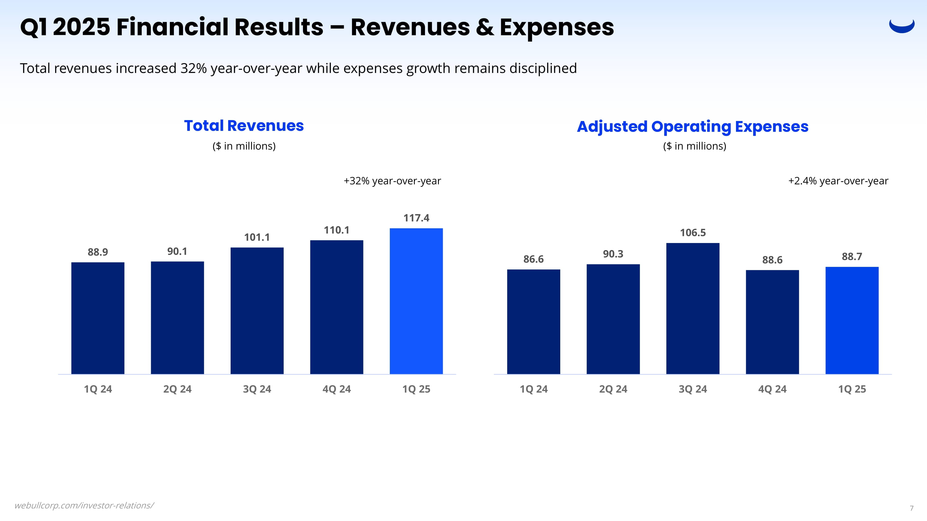 Equity Notional Volume ($ in billions) Q1 2025 Business Results – Trading 6 Options Contracts Volume (in millions) 111 102 119 128 128 1Q 24 2Q 24 3Q 24 4Q 24 1Q 25 +15% year - over - year 112 118 119 112 121 1Q 24 2Q 24 3Q 24 4Q 24 1Q 25 +8% year - over - year webullcorp.com/investor - relations/ Core products of equities and options trading volume increased 15% and 8% year - over - year, respectively