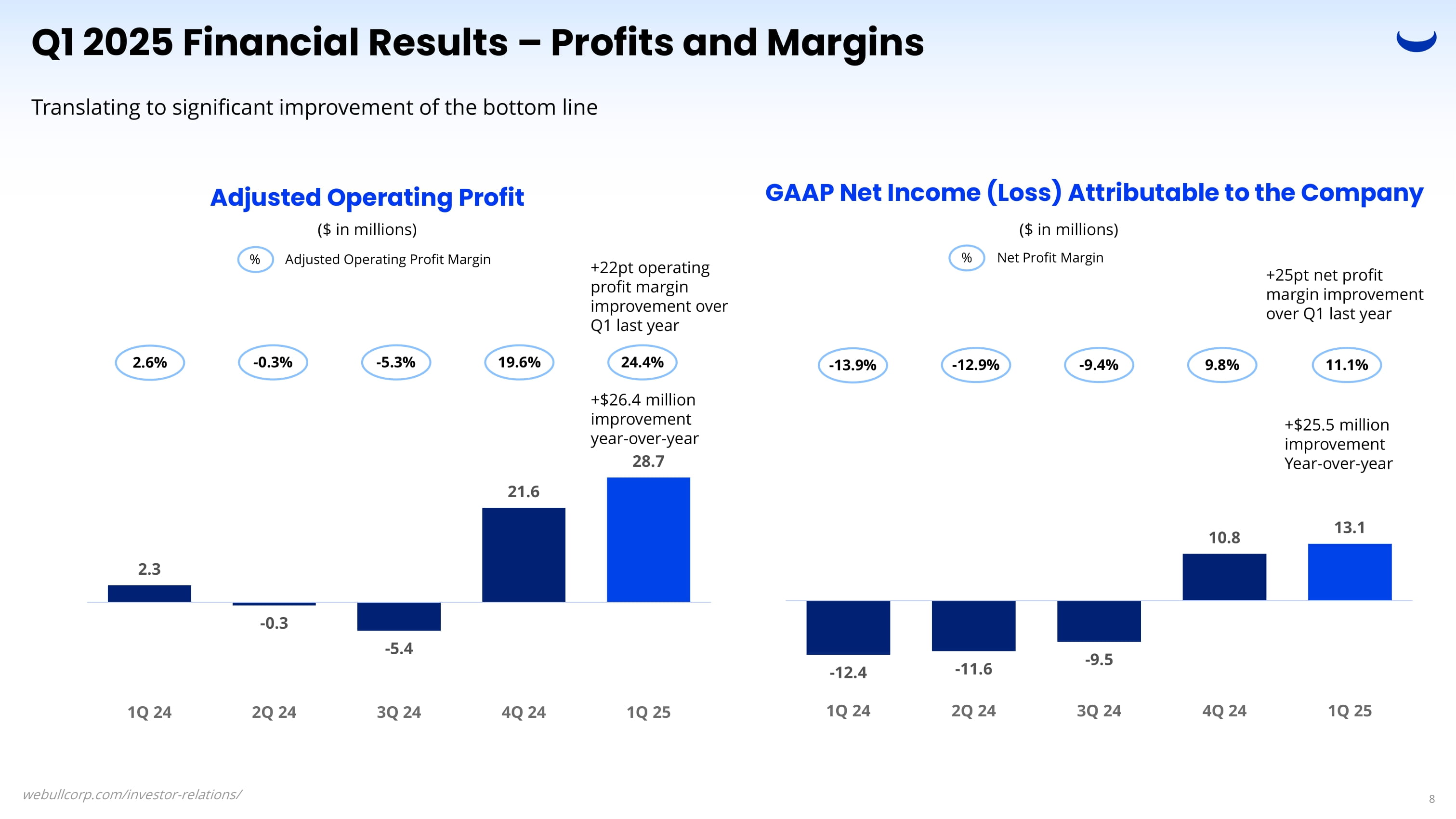 Total Revenues ($ in millions) Q1 2025 Financial Results – Revenues & Expenses 7 Adjusted Operating Expenses ($ in millions) +32% year - over - year +2.4% year - over - year webullcorp.com/investor - relations/ Total revenues increased 32% year - over - year while expenses growth remains disciplined 88.9 90.1 101.1 110.1 117.4 1Q 24 2Q 24 3Q 24 4Q 24 1Q 25 86.6 90.3 106.5 88.6 88.7 1Q 24 2Q 24 3Q 24 4Q 24 1Q 25