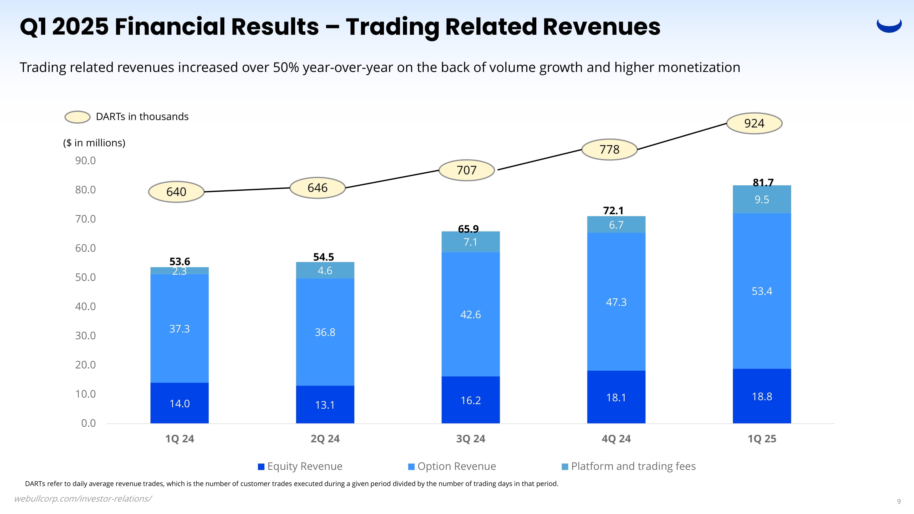 Adjusted Operating Profit ($ in millions) Q1 2025 Financial Results – Profits and Margins 8 GAAP Net Income (Loss) Attributable to the Company ($ in millions) +$25.5 million improvement Year - over - year webullcorp.com/investor - relations/ Translating to significant improvement of the bottom line 2.6% - 0.3% - 5.3% 19.6% 24.4% % Adjusted Operating Profit Margin +22pt operating profit margin improvement over Q1 last year % Net Profit Margin - 13.9% - 12.9% - 9.4% 9.8% 11.1% +25pt net profit margin improvement over Q1 last year 2.3 - 0.3 - 5.4 21.6 28.7 1Q 24 2Q 24 3Q 24 4Q 24 1Q 25 - 12.4 - 11.6 - 9.5 10.8 13.1 1Q 24 2Q 24 3Q 24 4Q 24 1Q 25 +$26.4 million improvement year - over - year