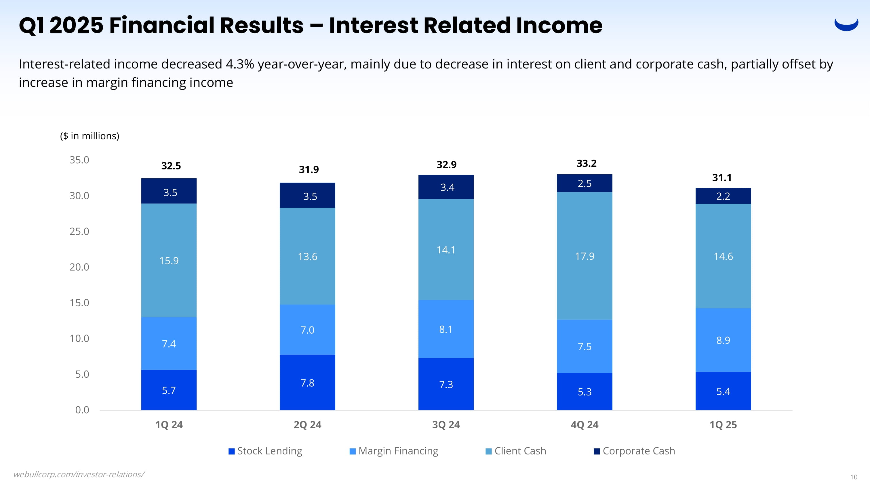 Q1 2025 Financial Results – Trading Related Revenues 9 webullcorp.com/investor - relations/ Trading related revenues increased over 50% year - over - year on the back of volume growth and higher monetization 14.0 13.1 16.2 18.1 18.8 37.3 36.8 42.6 47.3 53.4 2.3 4.6 7.1 6.7 9.5 0.0 10.0 20.0 30.0 40.0 50.0 60.0 70.0 80.0 90.0 1Q 24 2Q 24 3Q 24 4Q 24 1Q 25 Equity Revenue Option Revenue Platform and trading fees ($ in millions) 53.6 54.5 65.9 72.1 81.7 640 646 707 778 924 DARTs in thousands DARTs refer to daily average revenue trades, which is the number of customer trades executed during a given period divided by th e number of trading days in that period.