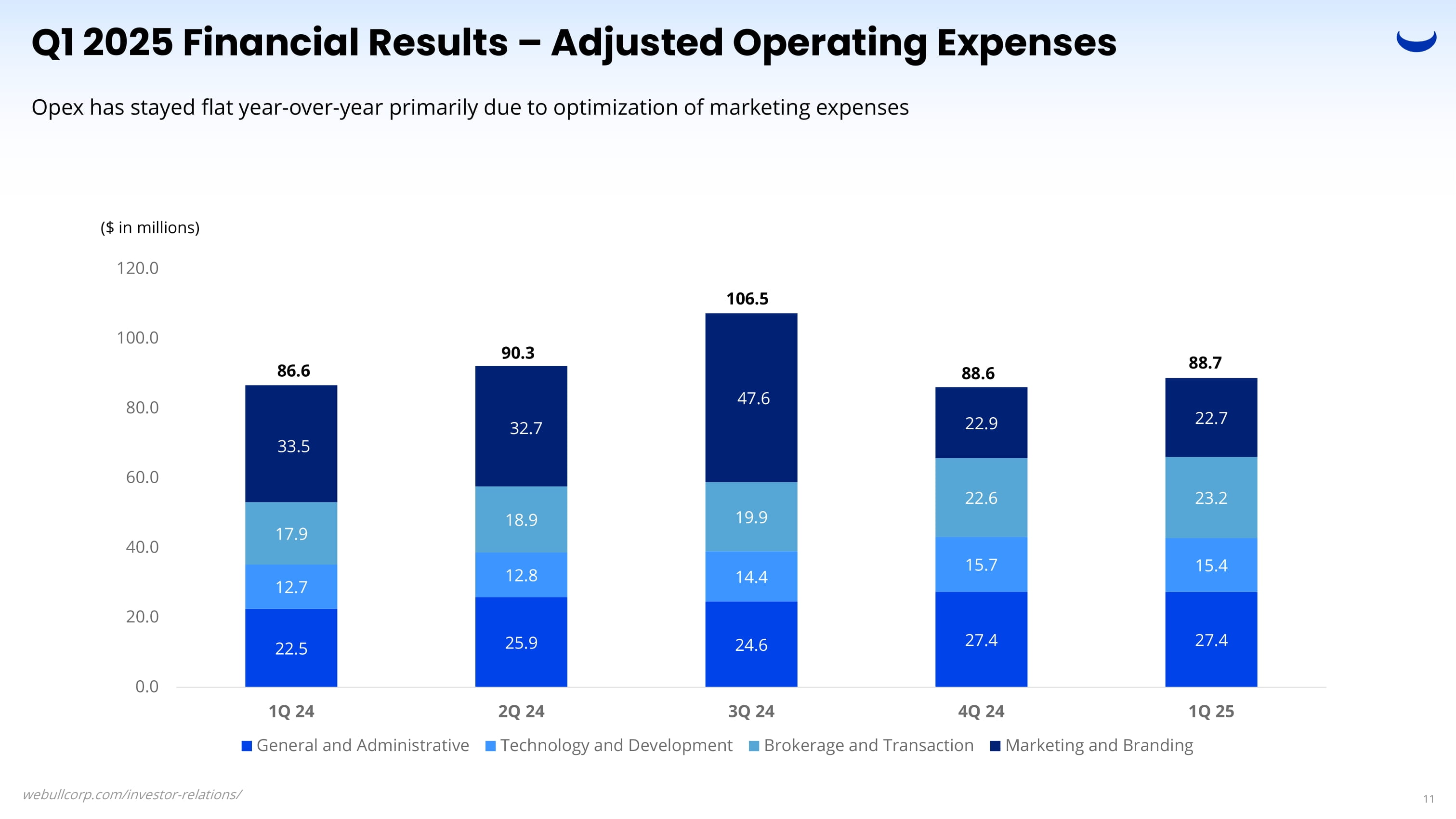 Q1 2025 Financial Results – Interest Related Income 10 webullcorp.com/investor - relations/ Interest - related income decreased 4.3% year - over - year, mainly due to decrease in interest on client and corporate cash, partiall y offset by increase in margin financing income 5.7 7.8 7.3 5.3 5.4 7.4 7.0 8.1 7.5 8.9 15.9 13.6 14.1 17.9 14.6 3.5 3.5 3.4 2.5 2.2 0.0 5.0 10.0 15.0 20.0 25.0 30.0 35.0 1Q 24 2Q 24 3Q 24 4Q 24 1Q 25 Stock Lending Margin Financing Client Cash Corporate Cash ($ in millions) 32.5 31.9 32.9 33.2 31.1