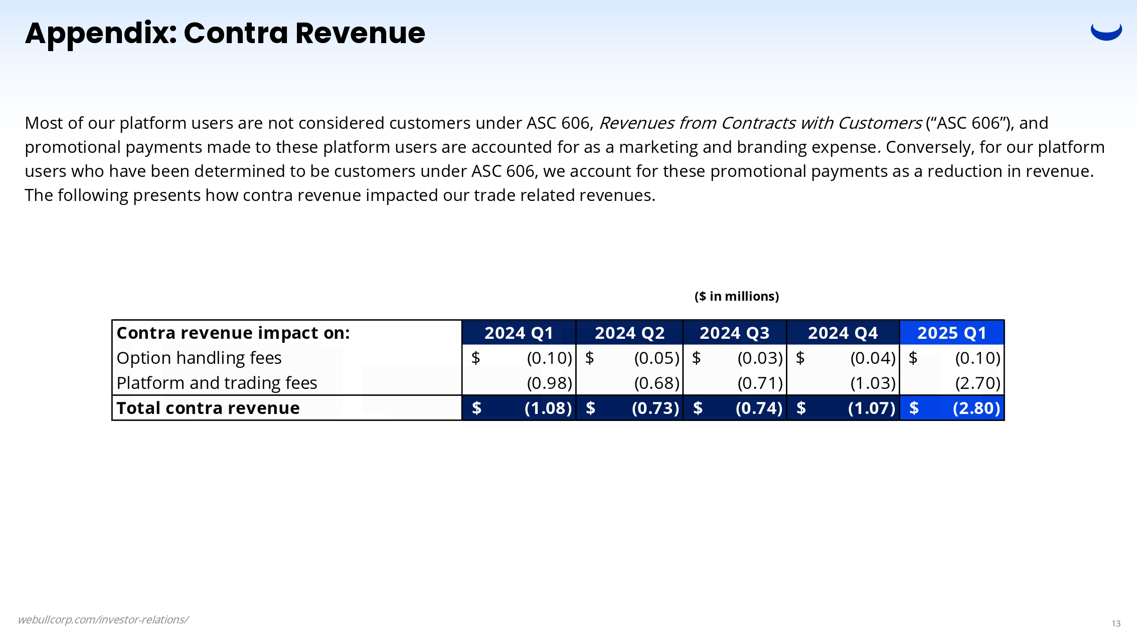 Appendix: Contra Revenue 13 webullcorp.com/investor - relations/ We offer marketing promotions to our platform users that are intended to increase the amount of platform users’ assets on our pl atform by incentivizing platform users to deposit more cash or transfer securities from other third - party brokerages into their Webull bro kerage account in return for a promotional payment in cash or free shares. Most of our platform users are not considered customers under ASC 606, Revenues from Contracts with Customers (“ASC 606”), and promotional payments made to these platform users are accounted for as a marketing and branding expense . Conversely , f or our platform users who have been determined to be customers under ASC 606, we account for these promotional payments as a reduction in revenue. The following presents how contr a revenue impacted our trade related revenues. ($ in millions) Contra revenue impact on: 2024 Q1 2024 Q2 2024 Q3 2024 Q4 2025 Q1 Option handling fees (0.10)$ (0.05)$ (0.03)$ (0.04)$ (0.10)$ Platform and trading fees (0.98) (0.68) (0.71) (1.03) (2.70) Total contra revenue (1.08)$ (0.73)$ (0.74)$ (1.07)$ (2.80)$