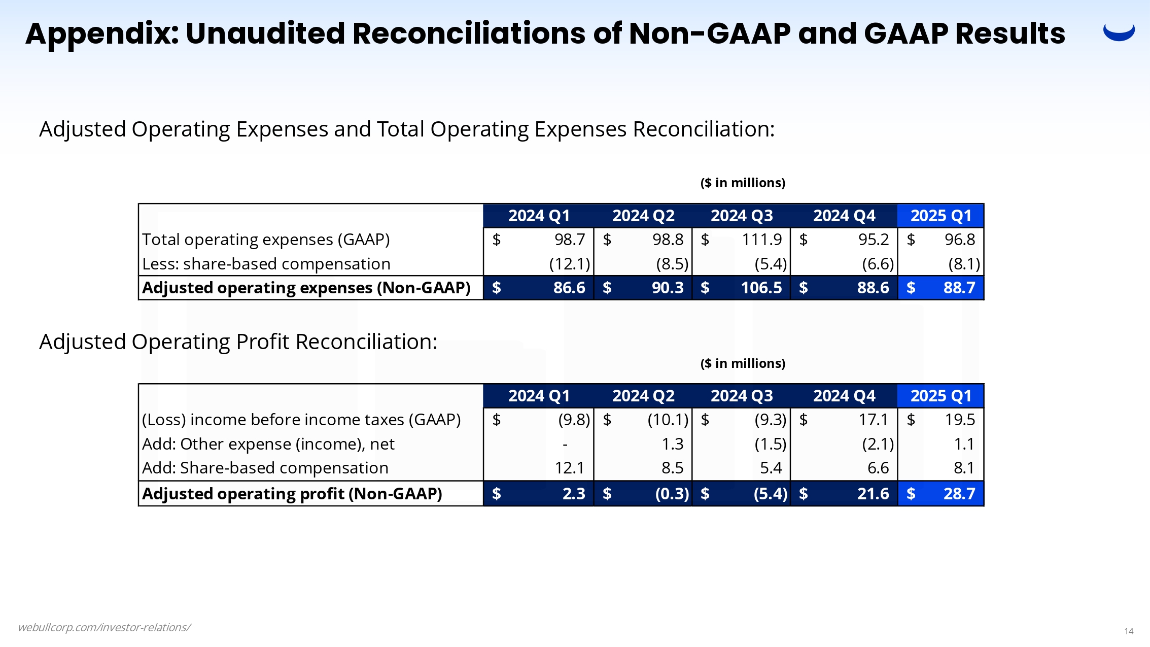 Appendix: Unaudited Reconciliations of Non - GAAP and GAAP Results (Cont.) 15 Adjusted Operating Expenses Reconciliation: Certain reclassifications have been made to prior year amounts to conform to the current year presentation. The impact of the se reclassifications is immaterial to the presentation of the financials taken as a whole. ($ in millions) Operating expenses (GAAP) 2024 Q1 2024 Q2 2024 Q3 2024 Q4 2025 Q1 Brokerage and transaction 17.9$ 19.0$ 19.9$ 22.5$ 23.2$ Technology and development 14.9 15.0 16.4 17.5 17.0 Marketing and branding (1) 34.0 33.2 48.2 23.3 23.0 General and administrative 31.9 31.6 27.4 31.9 33.6 Total operating expenses 98.7 98.8 111.9 95.2 96.8 Less: Share-based compensation 2024 Q1 2024 Q2 2024 Q3 2024 Q4 2025 Q1 Technology and development 2.2 2.2 2.1 1.8 1.5 Marketing and branding 0.5 0.5 0.5 0.5 0.3 General and administrative 9.4 5.8 2.8 4.3 6.3 Total share-based compensation 12.1 8.5 5.4 6.6 8.1 Adjusted operating expenses (Non-GAAP) 2024 Q1 2024 Q2 2024 Q3 2024 Q4 2025 Q1 Brokerage and transaction 17.9 19.0 19.9 22.5 23.2 Technology and development 12.7 12.8 14.3 15.7 15.5 Marketing and branding 33.5 32.7 47.7 22.8 22.7 General and administrative 22.5 25.8 24.6 27.6 27.3 Total adjusted operating expenses 86.6$ 90.3$ 106.5$ 88.6$ 88.7$