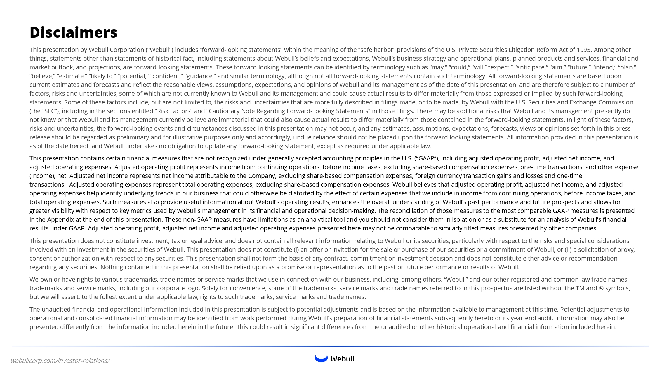 This presentation by Webull Corporation (“ Webull ”) includes “forward - looking statements” within the meaning of the “safe harbor” provisions of the U.S. Private Securities Litig ation Reform Act of 1995. Among other things, statements other than statements of historical fact, including statements about Webull’s beliefs and expectations, Webull’s business strategy and operational plans, planned products and services, financial and market outlook, and projections, are forward - looking statements. These forward - looking statements can be identified by terminolo gy such as “may,” “could,” “will,” “expect,” “anticipate,” “aim,” “future,” “intend,” “plan,” “believe,” “estimate,” “likely to,” “potential,” “confident,” “guidance,” and similar terminology, although not all forward - look ing statements contain such terminology. All forward - looking statements are based upon current estimates and forecasts and reflect the reasonable views, assumptions, expectations, and opinions of Webull and its management as of the date of this presentation, and are therefore subject to a number of factors, risks and uncertainties, some of which are not currently known to Webull and its management and could cause actual results to differ materially from those expressed or implied by such forward - looking statements. Some of these factors include, but are not limited to, the risks and uncertainties that are more fully described in filings made, or to be made, by Webull with the U.S. Securities and Exchange Commission (the “SEC”), including in the sections entitled “Risk Factors” and “Cautionary Note Regarding Forward - Looking Statements” in tho se filings. There may be additional risks that Webull and its management presently do not know or that Webull and its management currently believe are immaterial that could also cause actual results to differ materially from those cont ai ned in the forward - looking statements. In light of these factors, risks and uncertainties, the forward - looking events and circumstances discussed in this presentation may not occur, and any esti mates, assumptions, expectations, forecasts, views or opinions set forth in this press release should be regarded as preliminary and for illustrative purposes only and accordingly, undue reliance should not be pl ace d upon the forward - looking statements. All information provided in this presentation is as of the date hereof, and Webull undertakes no obligation to update any forward - looking statement, except as required under applicable law. This presentation contains certain financial measures that are not recognized under generally accepted accounting principles in the U.S. (“GAAP”), including adjusted operating profit, adjusted net income, and adjusted operating expenses. Adjusted operating profit represents income from continuing operations, before income taxes, exc lud ing share - based compensation expenses, one - time transactions, and other expense (income), net. Adjusted net income represents net income attributable to the Company, excluding share - based compensation expense s, foreign currency transaction gains and losses and one - time transactions. Adjusted operating expenses represent total operating expenses, excluding share - based compensation expenses. Webull believes that adjusted operating profit, adjusted net income, and adjusted operating expenses help identify underlying trends in our business that could otherwise be distorted by the effect of certain ex penses that we include in income from continuing operations, before income taxes, and total operating expenses. Such measures also provide useful information about Webull’s operating results, enhances the overall understanding of Webull’s past performance and future prospects and allows for greater visibility with respect to key metrics used by Webull’s management in its financial and operational decision - making. The reconciliation of those measures to the most comparable GAAP m easures is presented in the Appendix at the end of this presentation. These non - GAAP measures have limitations as an analytical tool and you should n ot consider them in isolation or as a substitute for an analysis of Webull’s financial results under GAAP. Adjusted operating profit, adjusted net income and adjusted operating expenses presented here may not be com parable to similarly titled measures presented by other companies. This presentation does not constitute investment, tax or legal advice, and does not contain all relevant information relating to Webull or its securities, particularly with respect to the risks and special considerations involved with an investment in the securities of Webull . This presentation does not constitute ( i ) an offer or invitation for the sale or purchase of our securities or a commitment of Webull , or (ii) a solicitation of proxy, consent or authorization with respect to any securities. This presentation shall not form the basis of any contract, commitme nt or investment decision and does not constitute either advice or recommendation regarding any securities. Nothing contained in this presentation shall be relied upon as a promise or representation as to th e p ast or future performance or results of Webull . We own or have rights to various trademarks, trade names or service marks that we use in connection with our business, includ ing , among others, “ Webull ” and our other registered and common law trade names, trademarks and service marks, including our corporate logo. Solely for convenience, some of the trademarks, service marks and tr ade names referred to in this prospectus are listed without the TM and ® symbols, but we will assert, to the fullest extent under applicable law, rights to such trademarks, service marks and trade names. The unaudited financial and operational information included in this presentation is subject to p