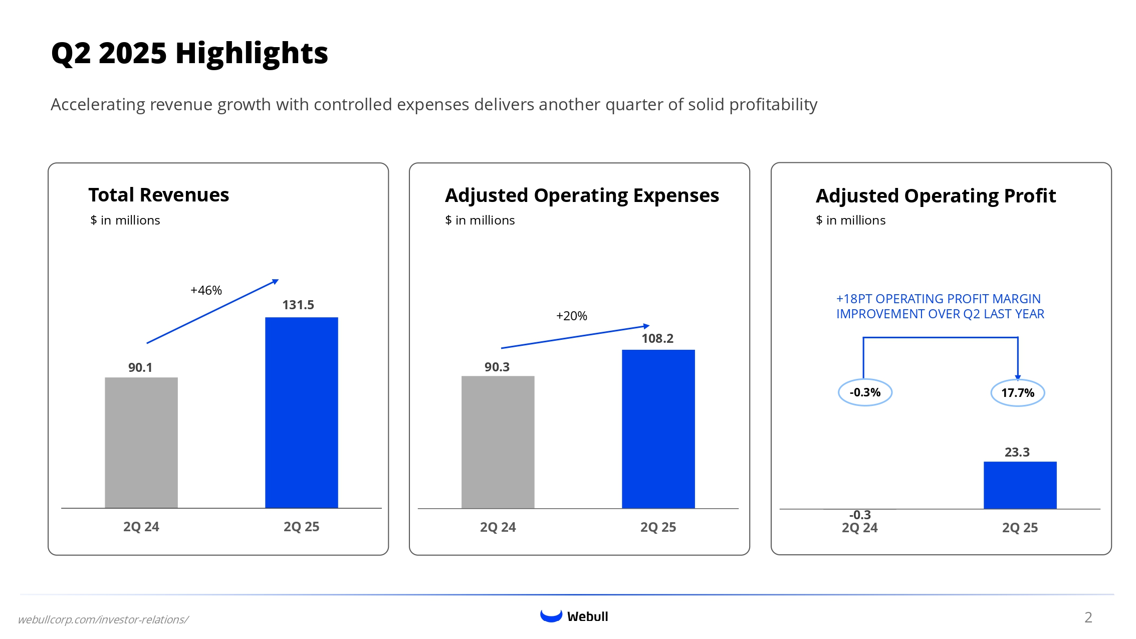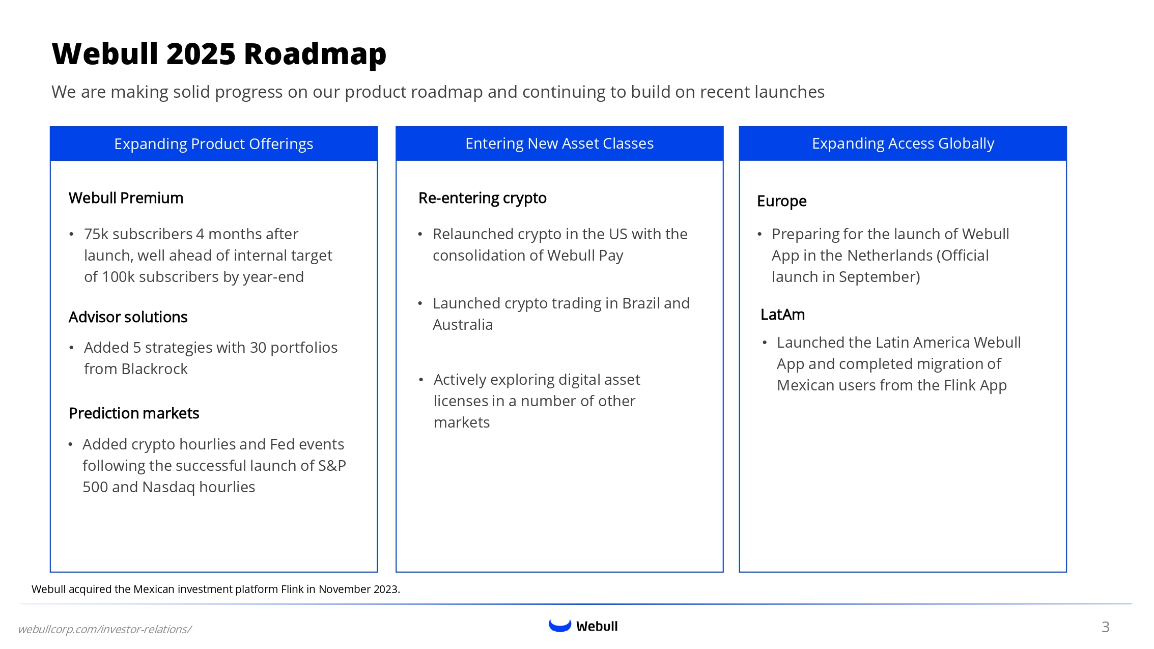Total Revenues $ in millions Q2 2025 Highlights Accelerating revenue growth with controlled expenses delivers another quarter of solid profitability 2 Adjusted Operating Expenses $ in millions webullcorp.com/investor - relations/ 90.1 131.5 2Q 24 2Q 25 90.3 108.2 2Q 24 2Q 25 +46% +20% Adjusted Operating Profit $ in millions - 0.3 23.3 2Q 24 2Q 25 - 0.3% 17.7% +18PT OPERATING PROFIT MARGIN IMPROVEMENT OVER Q2 LAST YEAR