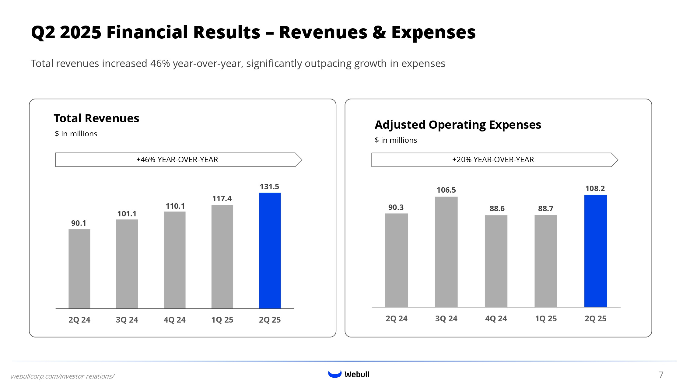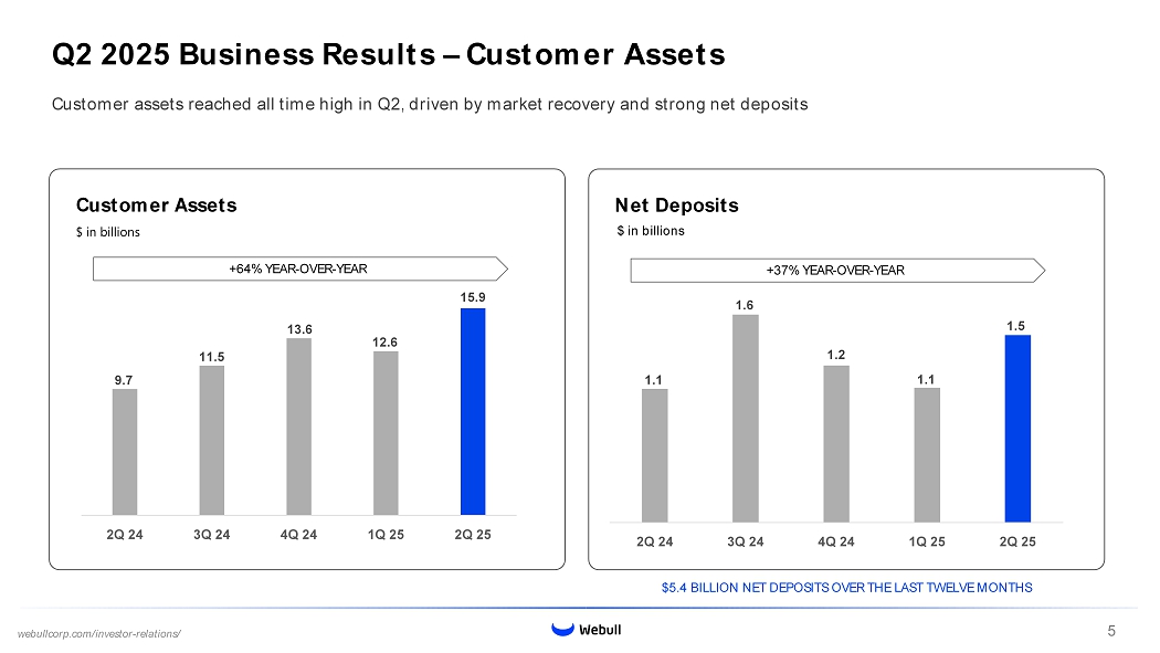 4.35 4.51 4.66 4.72 4.73 2Q 24 3Q 24 4Q 24 1Q 25 2Q 25 97.9% 98.4% Q2 2025 Business Results – Users and Accounts 4 Funded Accounts in millions Registered Users in millions % Quarterly Retention webullcorp.com/investor - relations/ 98.3% 97.5% +18% YEAR - OVER - YEAR Registered users increased 18% year - over - year to 24.9 million, while funded accounts grew 9% year - over - year to 4.73 million 21.1 22.1 23.3 24.1 24.9 2Q 24 3Q 24 4Q 24 1Q 25 2Q 25 97.1% +9% YEAR - OVER - YEAR