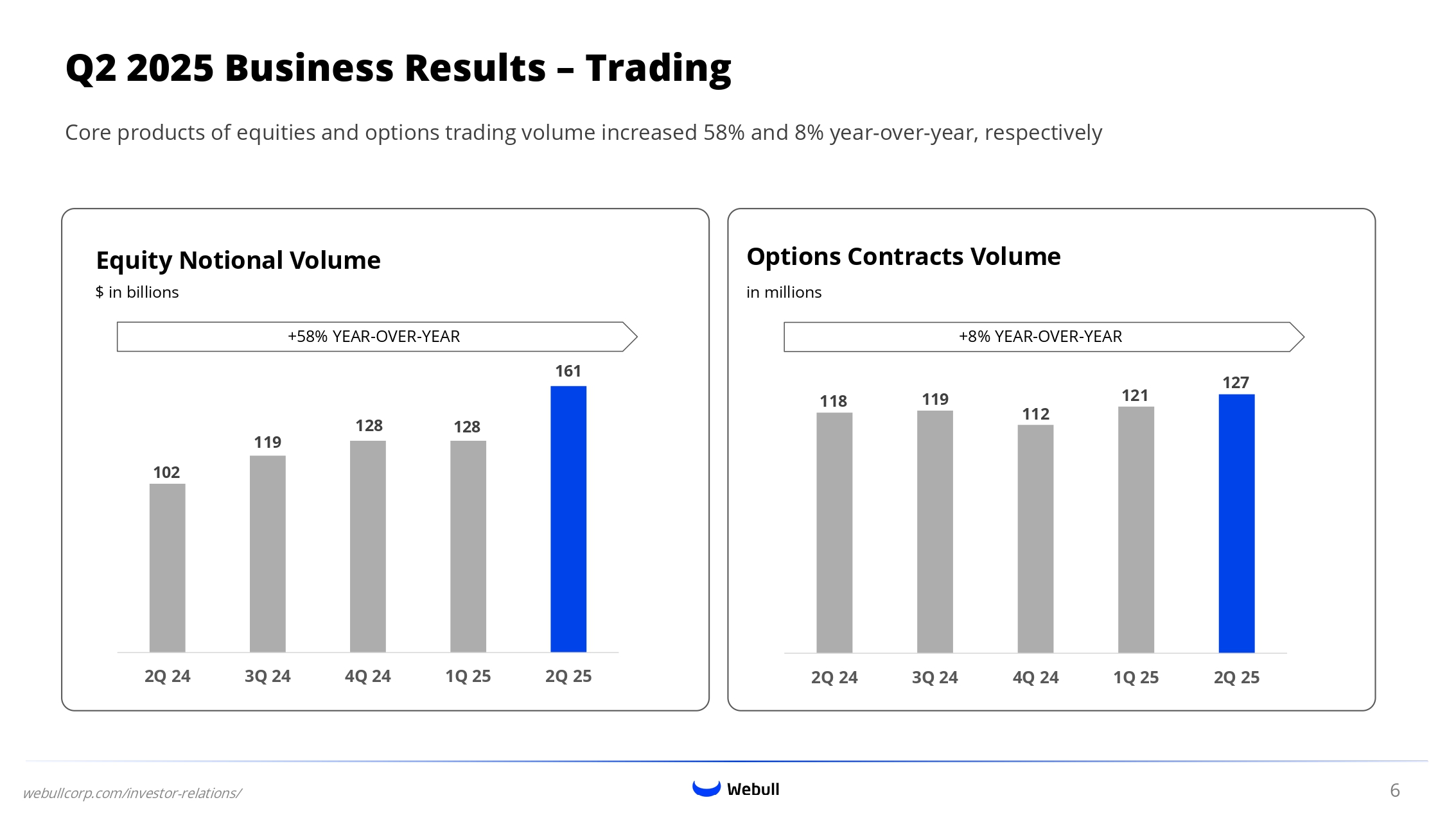 Q2 2025 Business Results – Customer Assets Customer assets reached all time high in Q2, driven by market recovery and strong net deposits 5 Net Deposits $ in billions webullcorp.com/investor - relations/ 1.1 1.6 1.2 1.1 1.5 2Q 24 3Q 24 4Q 24 1Q 25 2Q 25 9.7 11.5 13.6 12.6 15.9 2Q 24 3Q 24 4Q 24 1Q 25 2Q 25 Customer Assets $ in billions +64% YEAR - OVER - YEAR +36% YEAR - OVER - YEAR $5. 4 BILLION NET DEPOSITS OVER THE LAST TWELVE MONTHS