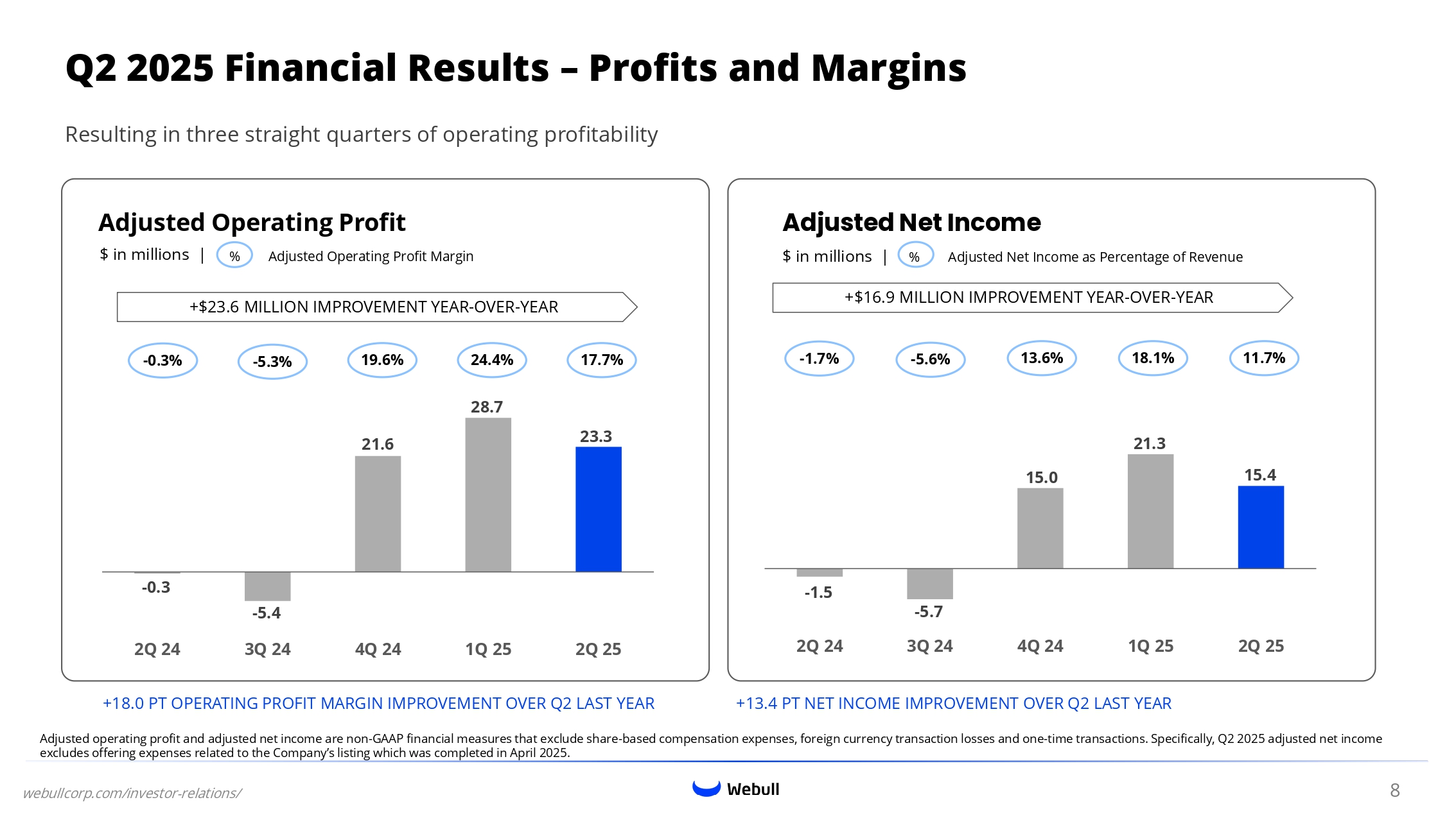 Total Revenues $ in millions Q2 2025 Financial Results – Revenues & Expenses Total revenues increased 46% year - over - year, significantly outpacing growth in expenses 7 Adjusted Operating Expenses $ in millions webullcorp.com/investor - relations/ 90.1 101.1 110.1 117.4 131.5 2Q 24 3Q 24 4Q 24 1Q 25 2Q 25 90.3 106.5 88.6 88.7 108.2 2Q 24 3Q 24 4Q 24 1Q 25 2Q 25 +46% YEAR - OVER - YEAR +20% YEAR - OVER - YEAR