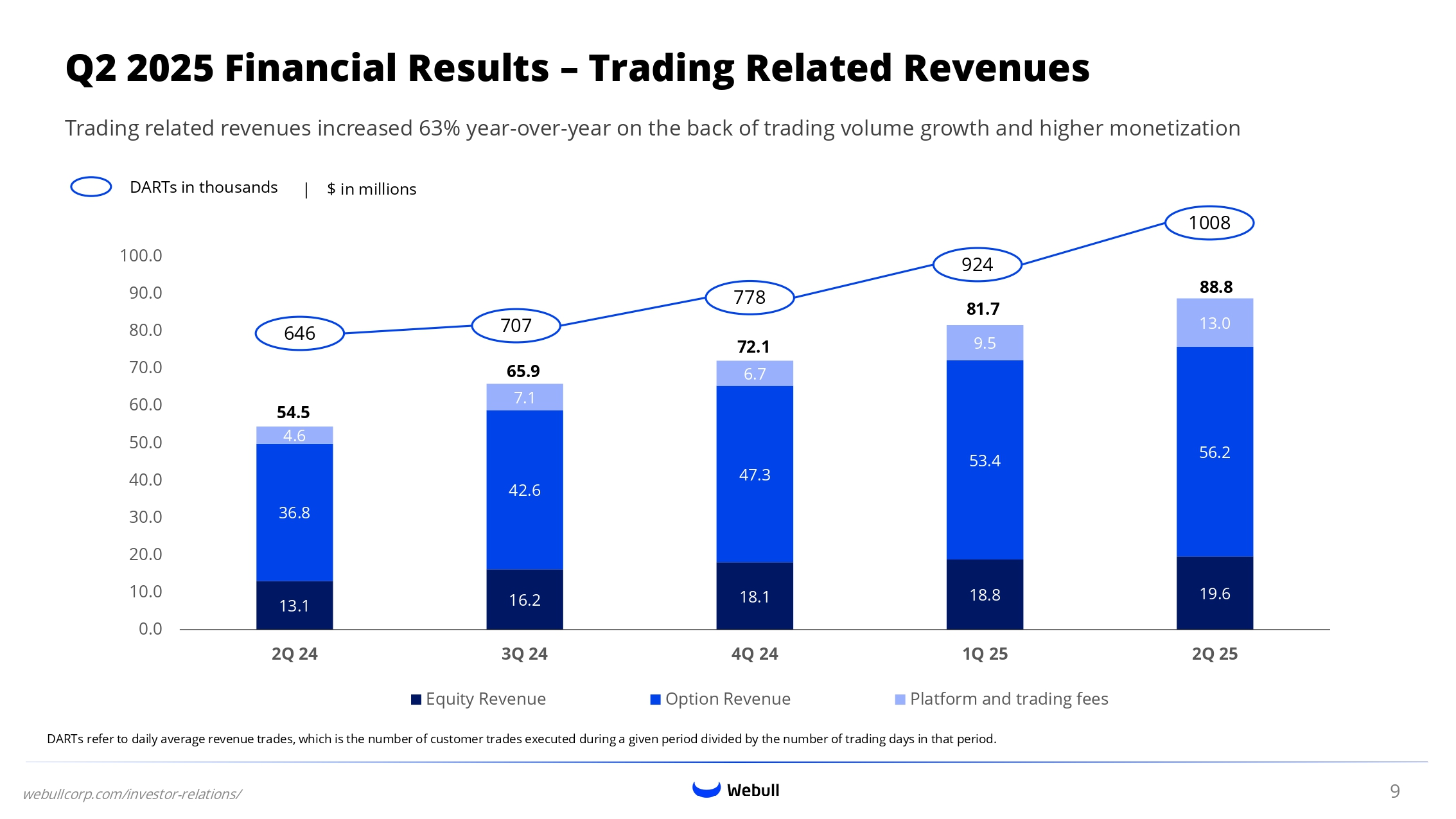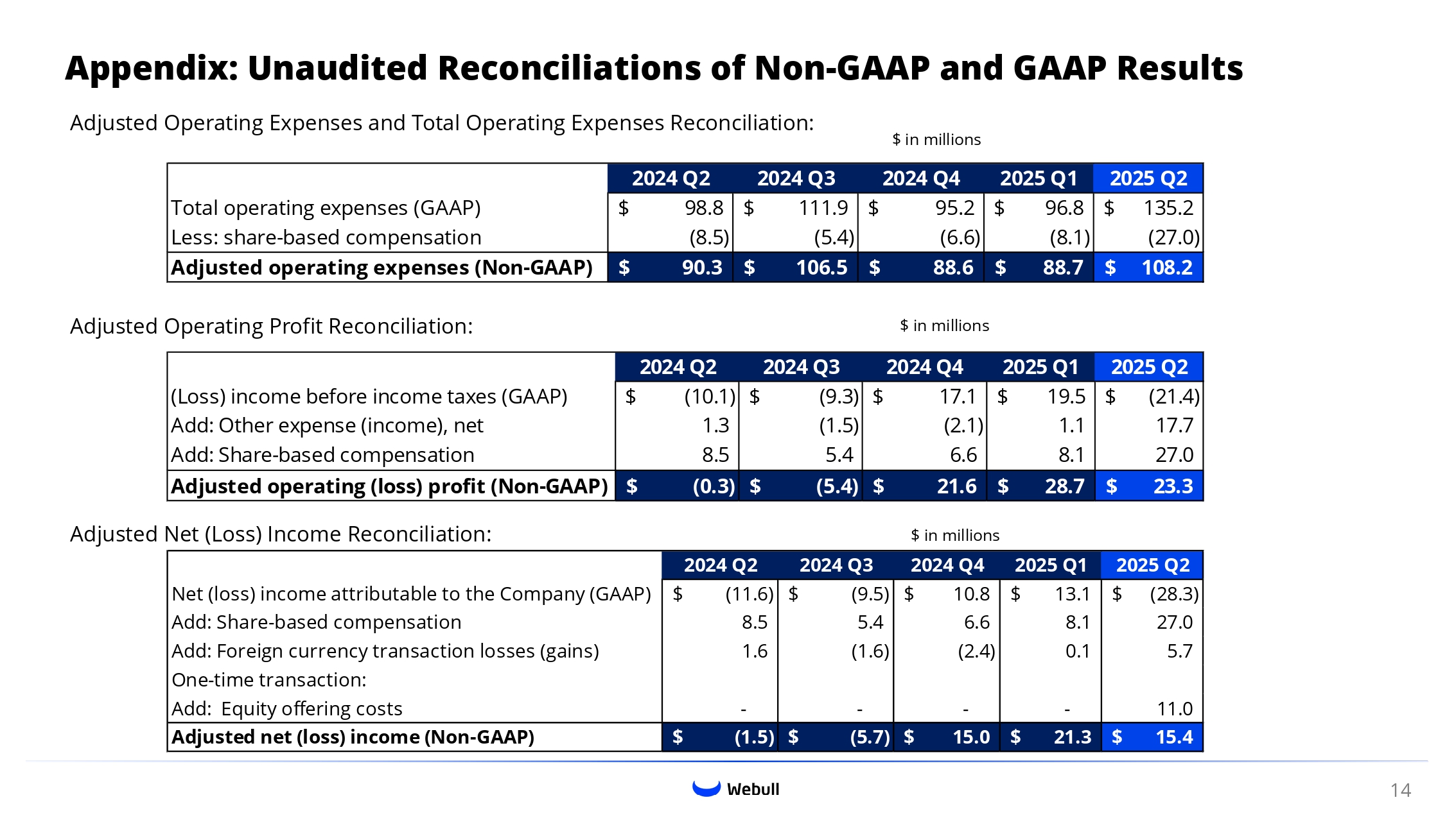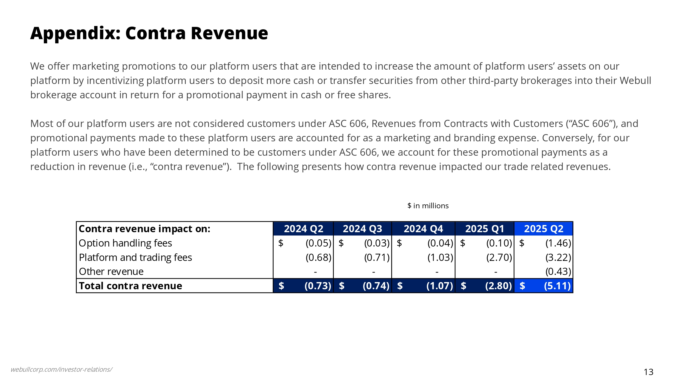 Appendix: Contra Revenue We offer marketing promotions to our platform users that are intended to increase the amount of platform users’ assets on our platform by incentivizing platform users to deposit more cash or transfer securities from other third - party brokerages into thei r Webull brokerage account in return for a promotional payment in cash or free shares. Most of our platform users are not considered customers under ASC 606, Revenues from Contracts with Customers (“ASC 606”), an d promotional payments made to these platform users are accounted for as a marketing and branding expense. Conversely, for our platform users who have been determined to be customers under ASC 606, we account for these promotional payments as a reduction in revenue (i.e., “contra revenue”). The following presents how contra revenue impacted our trade related revenues . 13 webullcorp.com/investor - relations/ $ in millions Contra revenue impact on: 2024 Q2 2024 Q3 2024 Q4 2025 Q1 2025 Q2 Option handling fees (0.05)$ (0.03)$ (0.04)$ (0.10)$ (1.46)$ Platform and trading fees (0.68) (0.71) (1.03) (2.70) (3.22) Other revenue - - - - (0.43) Total contra revenue (0.73)$ (0.74)$ (1.07)$ (2.80)$ (5.11)$
