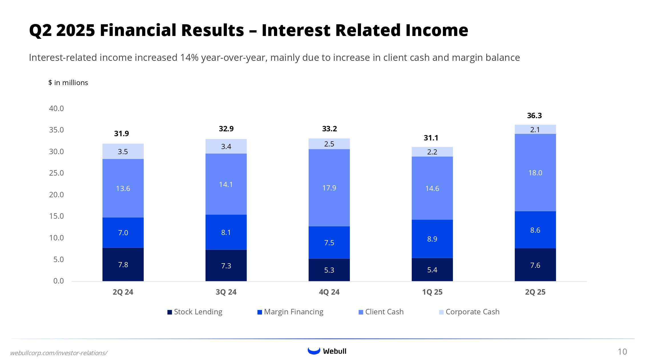 Q2 2025 Financial Results – Trading Related Revenues Trading related revenues increased 63% year - over - year on the back of trading volume growth and higher monetization 9 webullcorp.com/investor - relations/ 13.1 16.2 18.1 18.8 19.6 36.8 42.6 47.3 53.4 56.2 4.6 7.1 6.7 9.5 13.0 0.0 10.0 20.0 30.0 40.0 50.0 60.0 70.0 80.0 90.0 100.0 2Q 24 3Q 24 4Q 24 1Q 25 2Q 25 Equity Revenue Option Revenue Platform and trading fees | $ in millions 54.5 65.9 72.1 81.7 88.8 646 707 778 924 1008 DARTs in thousands DARTs refer to daily average revenue trades, which is the number of customer trades executed during a given period divided by th e number of trading days in that period.