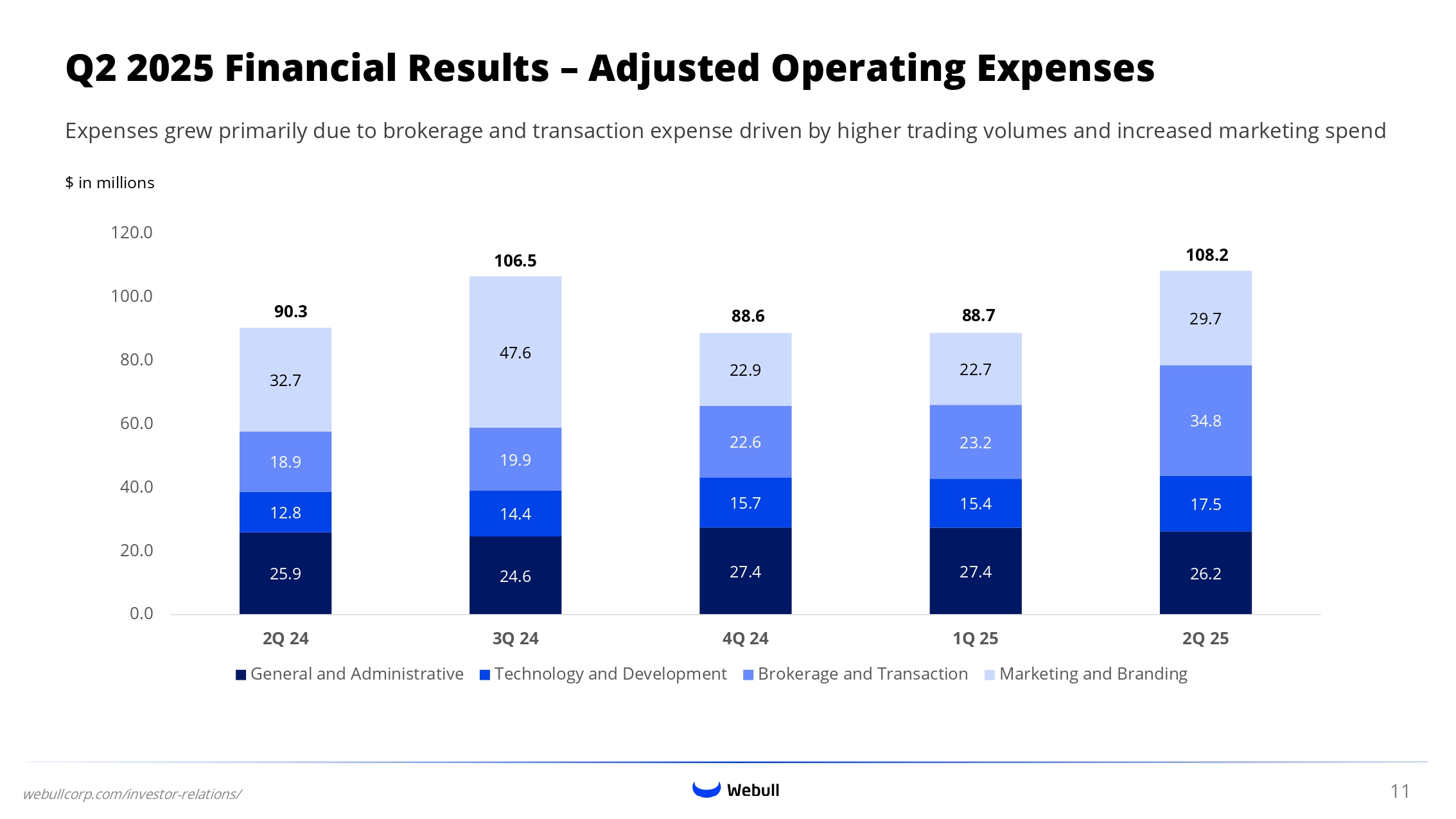 Q2 2025 Financial Results – Interest Related Income Interest - related income increased 14% year - over - year, mainly due to increase in client cash and margin balance 10 webullcorp.com/investor - relations/ 7.8 7.3 5.3 5.4 7.6 7.0 8.1 7.5 8.9 8.6 13.6 14.1 17.9 14.6 18.0 3.5 3.4 2.5 2.2 2.1 0.0 5.0 10.0 15.0 20.0 25.0 30.0 35.0 40.0 2Q 24 3Q 24 4Q 24 1Q 25 2Q 25 Stock Lending Margin Financing Client Cash Corporate Cash $ in millions 31.9 32.9 33.2 31.1 36.3