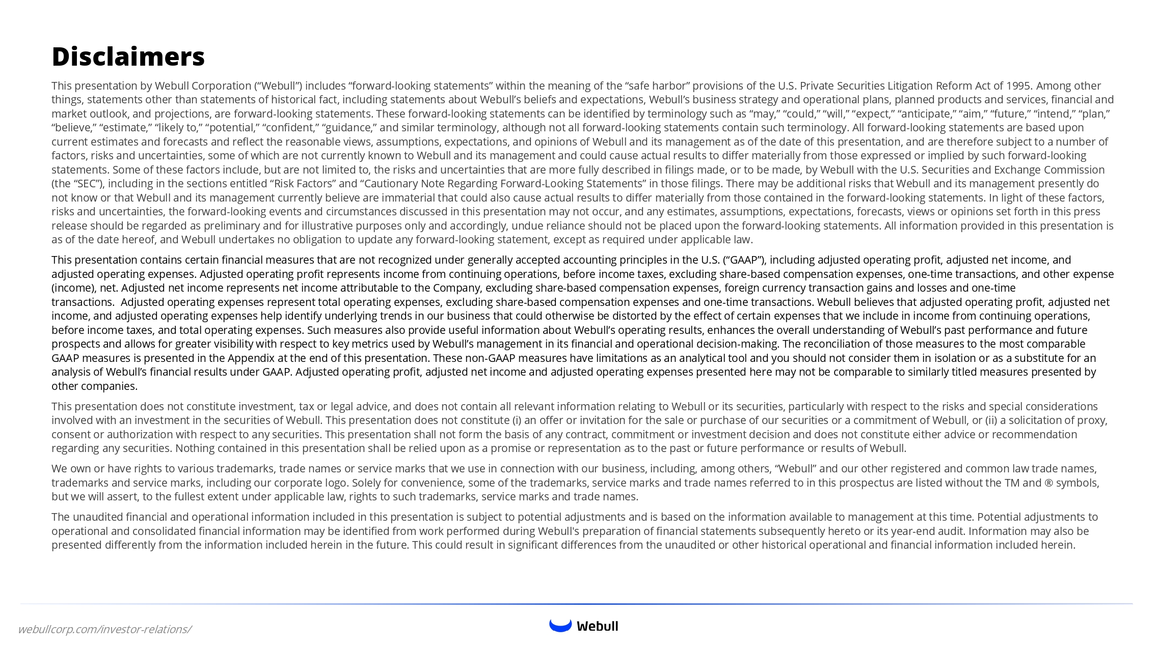 This presentation by Webull Corporation (“Webull”) includes “forward - looking statements” within the meaning of the “safe harbor” provisions of the U.S. Private Securities Litigation Reform Act of 1995. Among other things, statements other than statements of historical fact, including statements about Webull’s beliefs and expectations, Webull’s business strategy and operational plans, planned products and services, financial and market outlook, and projections, are forward - looking statements. These forward - looking statements can be identified by terminology such as “may,” “could,” “will,” “expect,” “anticipate,” “aim,” “future,” “intend,” “plan,” “believe,” “estimate,” “likely to,” “potential,” “confident,” “guidance,” and similar terminology, although not all forward - looking statements contain such terminology. All forward - looking statements are based upon current estimates and forecasts and reflect the reasonable views, assumptions, expectations, and opinions of Webull and its management as of the date of this presentation, and are therefore subject to a number of factors, risks and uncertainties, some of which are not currently known to Webull and its management and could cause actual results to differ materially from those expressed or implied by such forward - looking statements. Some of these factors include, but are not limited to, the risks and uncertainties that are more fully described in filings made, or to be made, by Webull with the U.S. Securities and Exchange Commission (the “SEC”), including in the sections entitled “Risk Factors” and “Cautionary Note Regarding Forward - Looking Statements” in those filings. There may be additional risks that Webull and its management presently do not know or that Webull and its management currently believe are immaterial that could also cause actual results to differ materially from those contained in the forward - looking statements. In light of these factors, risks and uncertainties, the forward - looking events and circumstances discussed in this presentation may not occur, and any estimates, assumptions, expectations, forecasts, views or opinions set forth in this press release should be regarded as preliminary and for illustrative purposes only and accordingly, undue reliance should not be placed upon the forward - looking statements. All information provided in this presentation is as of the date hereof, and Webull undertakes no obligation to update any forward - looking statement, except as required under applicable law. This presentation contains certain financial measures that are not recognized under generally accepted accounting principles in the U.S. (“GAAP”), including adjusted operating profit, adjusted net income, and adjusted operating expenses. Adjusted operating profit represents income from continuing operations, before income taxes, excluding share - based compensation expenses, one - time transactions, and other expense (income), net. Adjusted net income represents net income attributable to the Company, excluding share - based compensation expenses, foreign currency transaction gains and losses and one - time transactions. Adjusted operating expenses represent total operating expenses, excluding share - based compensation expenses and one - time transactions. Webull believes that adjusted operating profit, adjusted net income, and adjusted operating expenses help identify underlying trends in our business that could otherwise be distorted by the effect of certain expenses that we include in income from continuing operations, before income taxes, and total operating expenses. Such measures also provide useful information about Webull’s operating results, enhances the overall understanding of Webull’s past performance and future prospects and allows for greater visibility with respect to key metrics used by Webull’s management in its financial and operational decision - making. The reconciliation of those measures to the most comparable GAAP measures is presented in the Appendix at the end of this presentation. These non - GAAP measures have limitations as an analytical tool and you should not consider them in isolation or as a substitute for an analysis of Webull’s financial results under GAAP. Adjusted operating profit, adjusted net income and adjusted operating expenses presented here may not be comparable to similarly titled measures presented by other companies. This presentation does not constitute investment, tax or legal advice, and does not contain all relevant information relating to Webull or its securities, particularly with respect to the risks and special considerations involved with an investment in the securities of Webull. This presentation does not constitute (i) an offer or invitation for the sale or purchase of our securities or a commitment of Webull, or (ii) a solicitation of proxy, consent or authorization with respect to any securities. This presentation shall not form the basis of any contract, commitment or investment decision and does not constitute either advice or recommendation regarding any securities. Nothing contained in this presentation shall be relied upon as a promise or representation as to the past or future performance or results of Webull. We own or have rights to various trademarks, trade names or service marks that we use in connection with our business, including, among others, “Webull” and our other registered and common law trade names, trademarks and service marks, including our corporate logo . Solely for convenience, some of the trademarks, service marks and trade names referred to in this prospectus are listed without the TM and ® symbols, but we will assert, to the fullest extent under applicable law, rights to such trademarks, service marks and trade names . The unaudited financial and operational information included in this presentation is subject to po