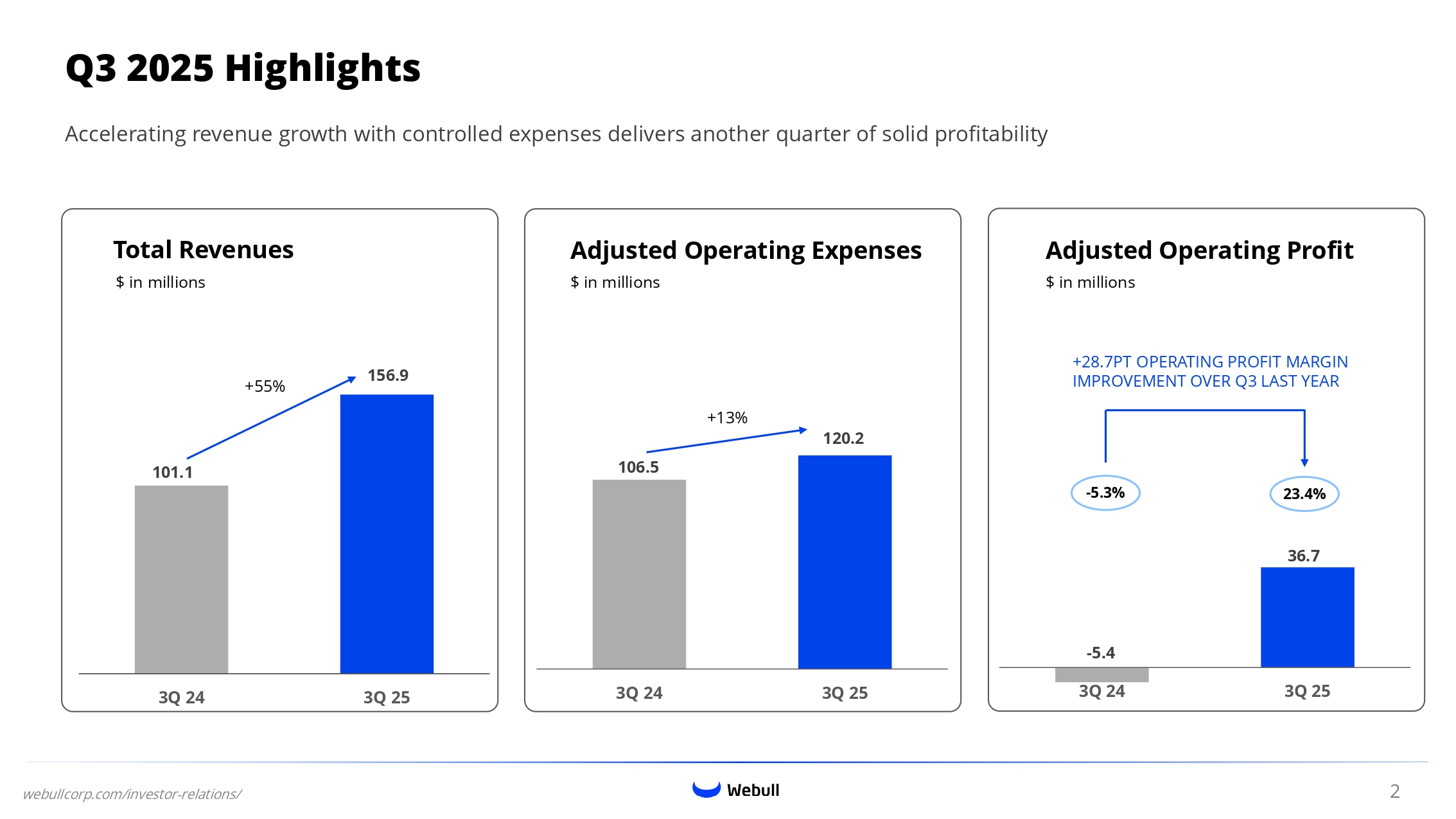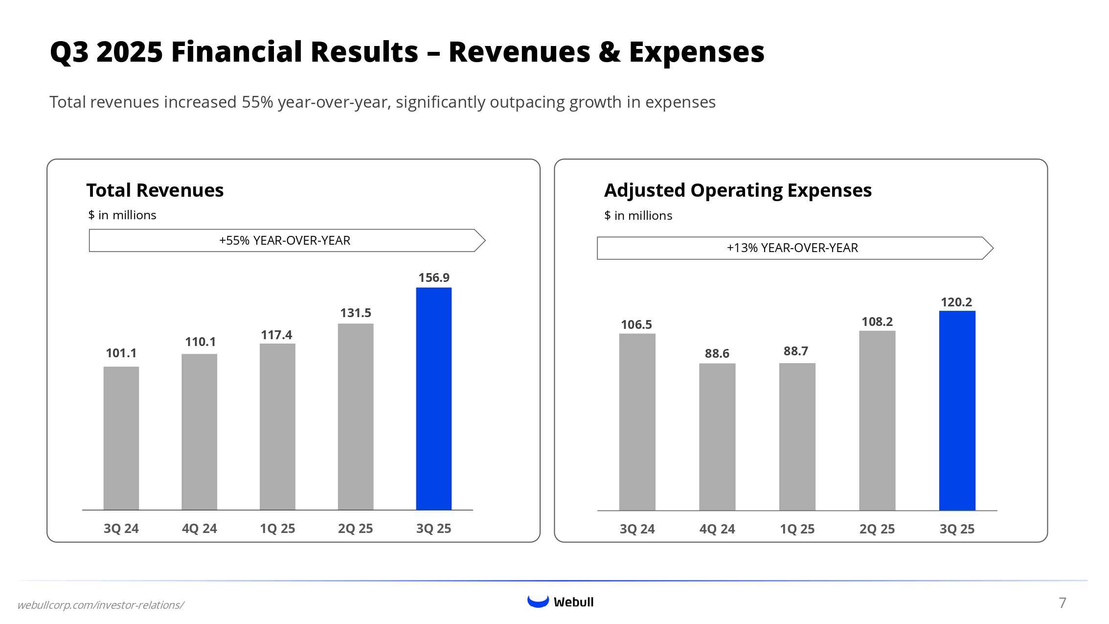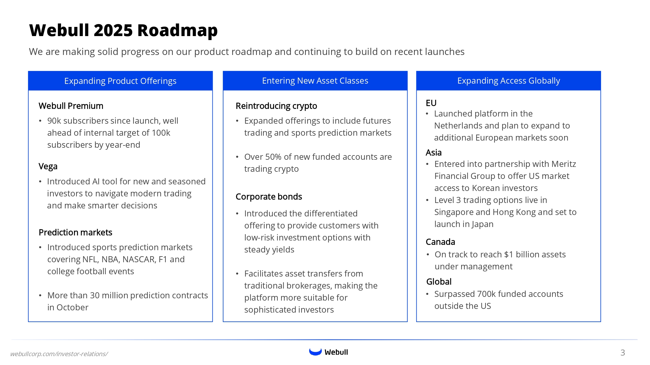 Total Revenues $ in millions Q3 2025 Highlights Accelerating revenue growth with controlled expenses delivers another quarter of solid profitability Adjusted Operating Expenses $ in millions 101.1 156.9 3Q 24 3Q 25 106.5 3Q 24 3Q 25 +13% 120.2 +55% Adjusted Operating Profit $ in millions - 5.4 36.7 3Q 24 3Q 25 - 5.3% 23.4% 2 webullcorp.com/investor - relations/ +28.7PT OPERATING PROFIT MARGIN IMPROVEMENT OVER Q3 LAST YEAR