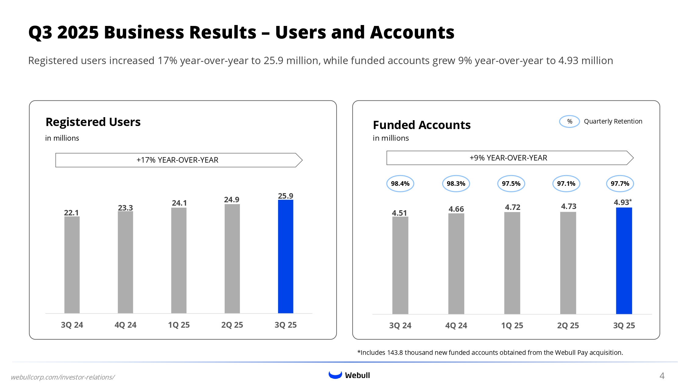 Webull 2025 Roadmap Expanding Product Offerings Entering New Asset Classes Expanding Access Globally • Over 50% of new funded accounts are trading crypto Reintroducing crypto • Expanded offerings to include futures trading and sports prediction markets We are making solid progress on our product roadmap and continuing to build on recent launches Prediction markets • Introduced sports prediction markets covering NFL, NBA, NASCAR, F1 and college football events • More than 30 million prediction contracts in October Webull Premium • 90k subscribers since launch, well ahead of internal target of 100k subscribers by year - end Vega • Introduced AI tool for new and seasoned investors to navigate modern trading and make smarter decisions • Facilitates asset transfers from traditional brokerages, making the platform more suitable for sophisticated investors Corporate bonds • Introduced the differentiated offering to provide customers with low - risk investment options with steady yields EU • Launched platform in the Netherlands and plan to expand to additional European markets soon Asia • Entered into partnership with Meritz Financial Group to offer US market access to Korean investors • Level 3 trading options live in Singapore and Hong Kong and set to launch in Japan Canada • On track to reach $1 billion assets under management Global • Surpassed 700k funded accounts outside the US 3 webullcorp.com/investor - relations/