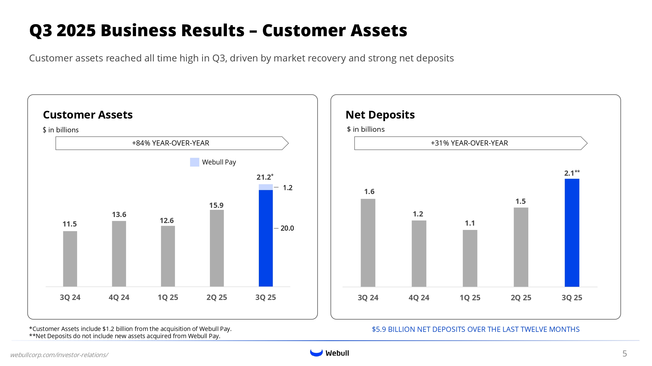 4.51 4.66 4.72 4.73 4.93 * 3Q 24 4Q 24 1Q 25 2Q 25 3Q 25 98.4% Q3 2025 Business Results – Users and Accounts Funded Accounts in millions Registered Users in millions % Quarterly Retention 98.3% 97.5% +17% YEAR - OVER - YEAR Registered users increased 17% year - over - year to 25.9 million, while funded accounts grew 9% year - over - year to 4.93 million 22.1 23.3 24.1 24.9 25.9 3Q 24 4Q 24 1Q 25 2Q 25 3Q 25 97.1% +9% YEAR - OVER - YEAR 97.7% 4 webullcorp.com/investor - relations/ *Includes 143.8 thousand new funded accounts obtained from the Webull Pay acquisition.