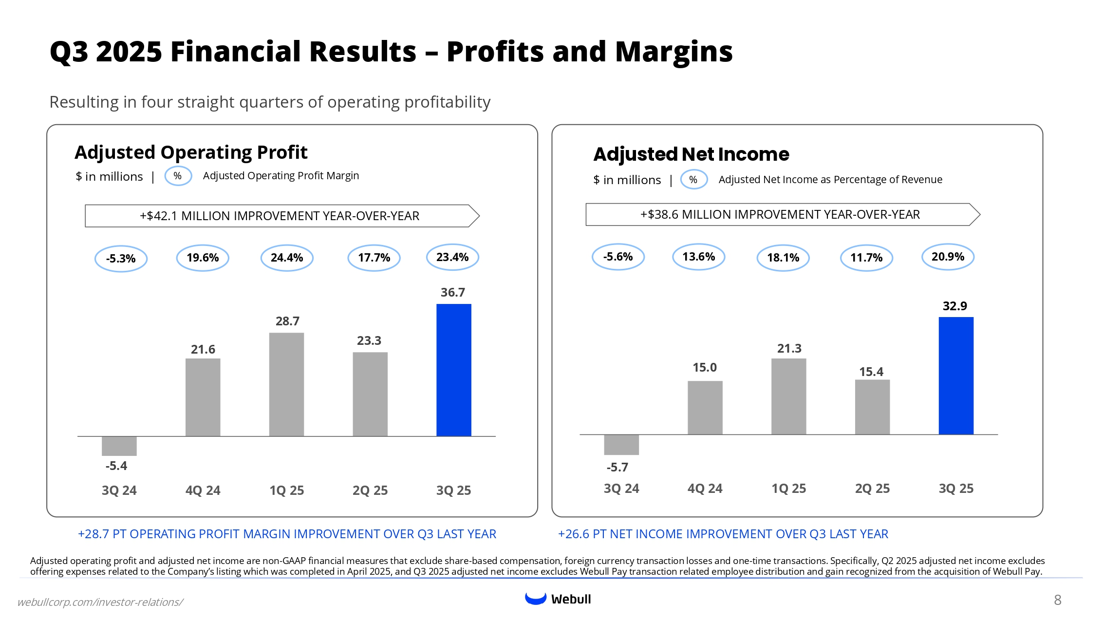 Q3 2025 Financial Results – Revenues & Expenses Total revenues increased 55% year - over - year, significantly outpacing growth in expenses Adjusted Operating Expenses $ in millions 101.1 110.1 117.4 131.5 156.9 3Q 24 4Q 24 1Q 25 2Q 25 3Q 25 106.5 88.6 88.7 108.2 120.2 3Q 24 4Q 24 1Q 25 2Q 25 3Q 25 Total Revenues $ in millions +55% YEAR - OVER - YEAR +13% YEAR - OVER - YEAR 7 webullcorp.com/investor - relations/