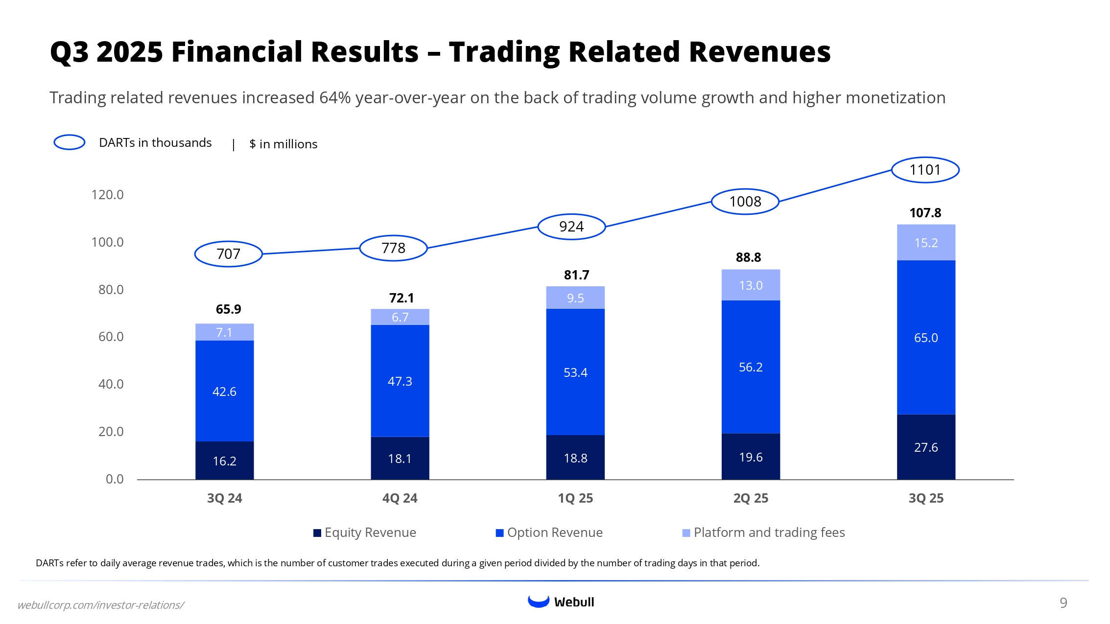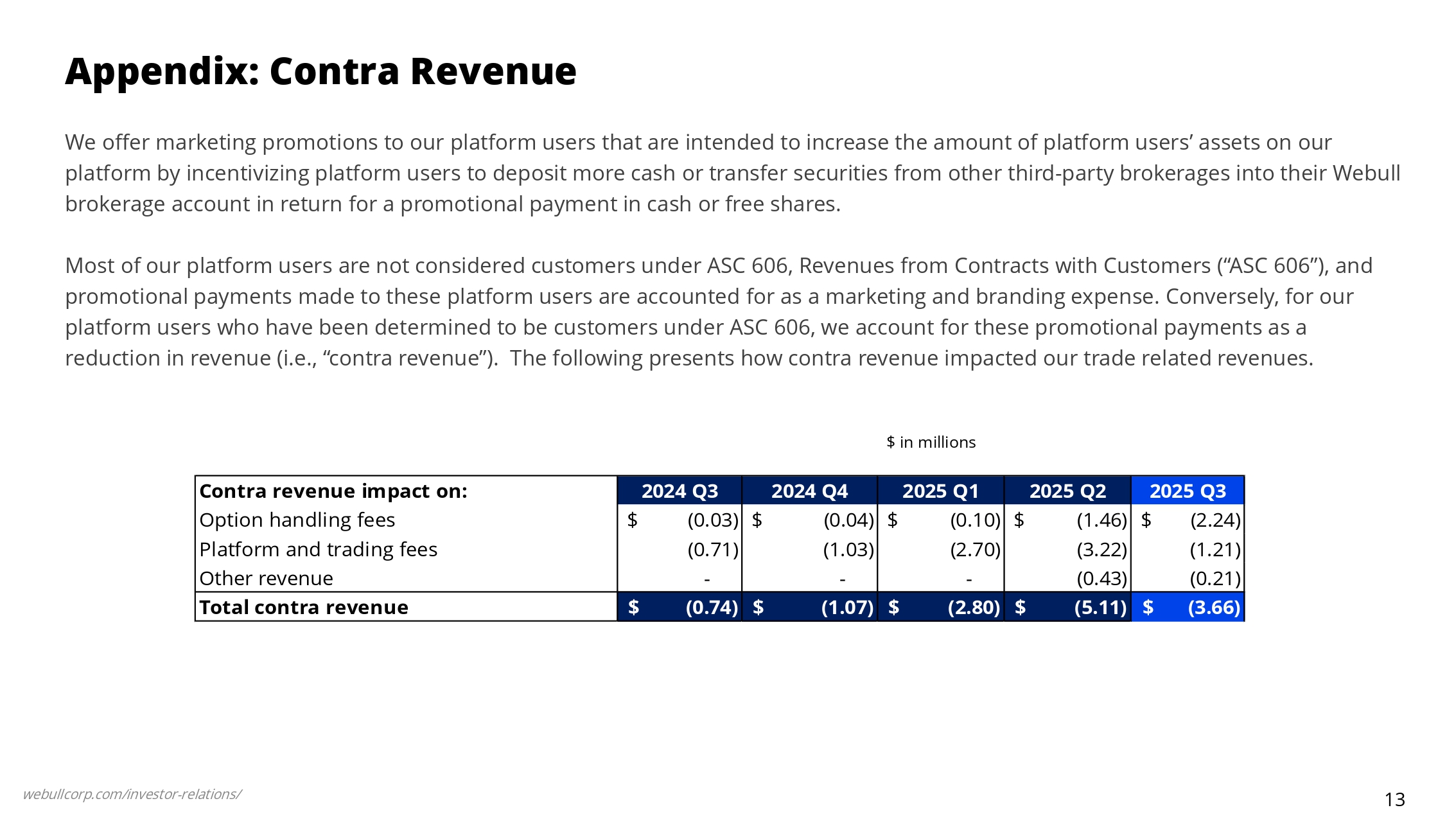 webullcorp.com/investor - relations/ 13 Appendix: Contra Revenue We offer marketing promotions to our platform users that are intended to increase the amount of platform users’ assets on our platform by incentivizing platform users to deposit more cash or transfer securities from other third - party brokerages into their Webull brokerage account in return for a promotional payment in cash or free shares. Most of our platform users are not considered customers under ASC 606, Revenues from Contracts with Customers (“ASC 606”), and promotional payments made to these platform users are accounted for as a marketing and branding expense. Conversely, for our platform users who have been determined to be customers under ASC 606, we account for these promotional payments as a reduction in revenue (i.e., “contra revenue”). The following presents how contra revenue impacted our trade related revenues. $ in millions 2025 Q3 2025 Q2 2025 Q1 2024 Q4 2024 Q3 Contra revenue impact on: Option handling fees Platform and trading fees Other revenue $ (2.24) (1.21) (0.21) $ (1.46) (3.22) (0.43) $ (0.10) (2.70) - $ (0.04) (1.03) - $ (0.03) (0.71) - $ (3.66) $ (5.11) $ (2.80) $ (1.07) $ (0.74) Total contra revenue