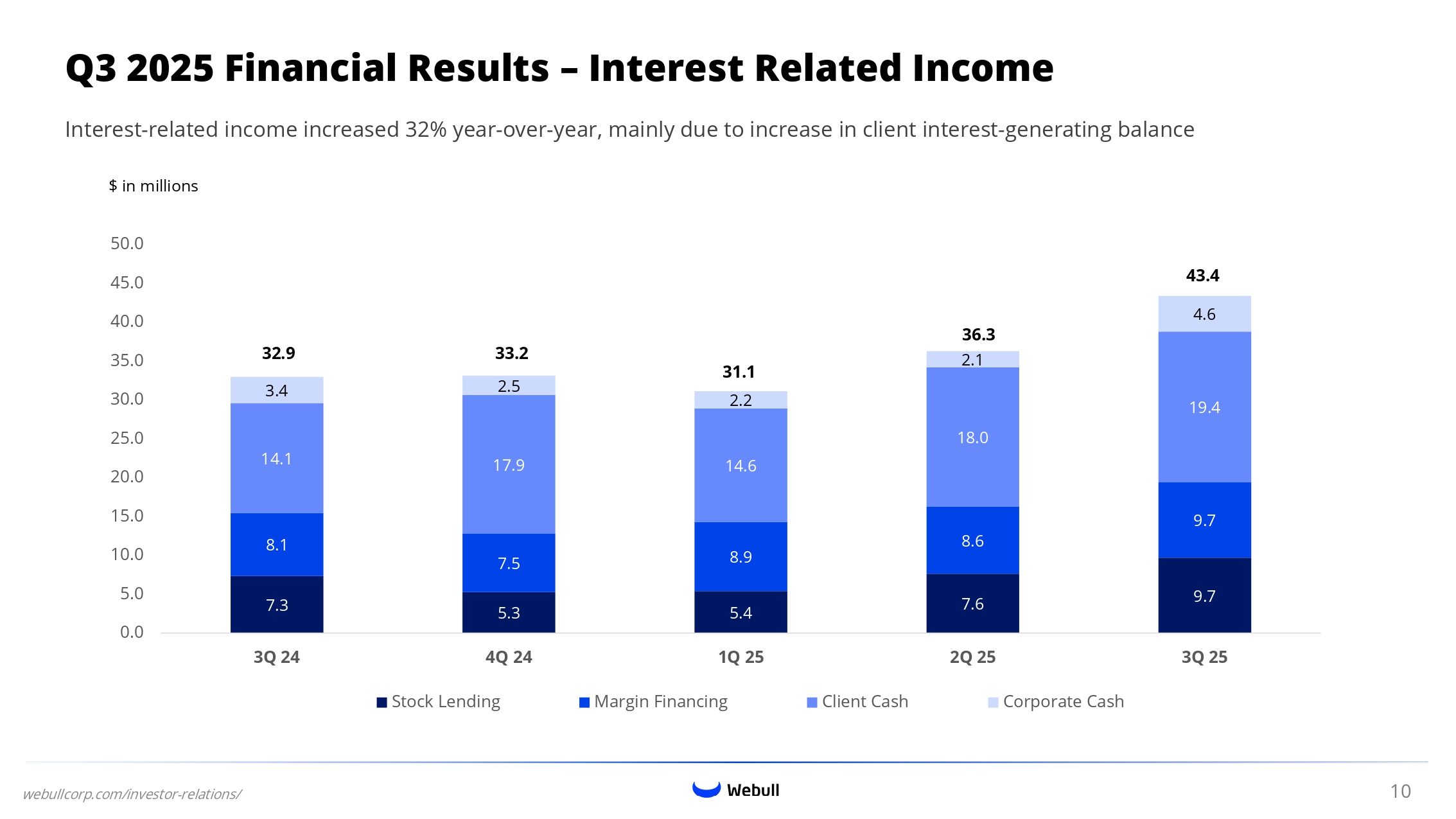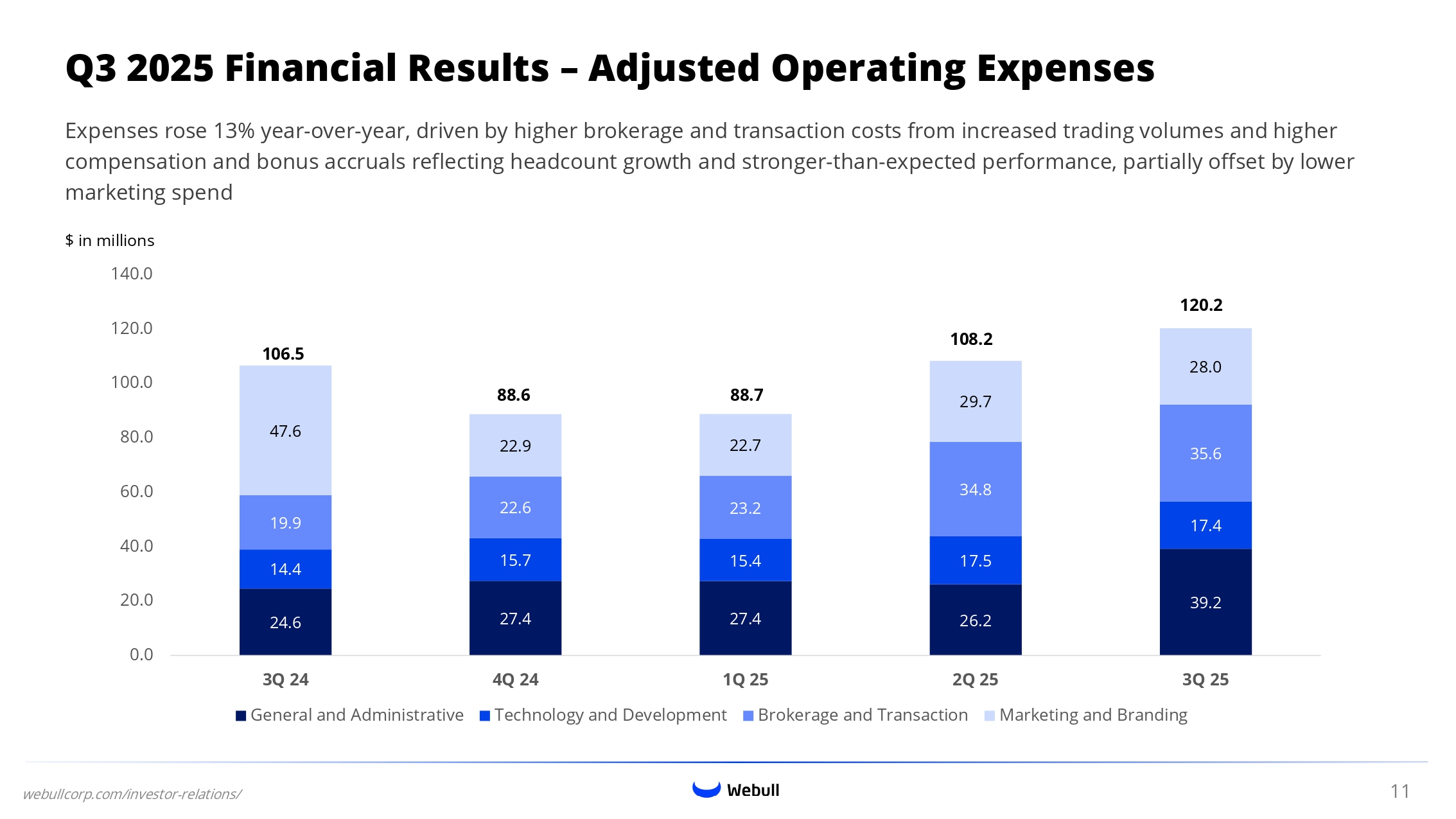 Q3 2025 Financial Results – Interest Related Income Interest - related income increased 32% year - over - year, mainly due to increase in client interest - generating balance $ in millions 7.3 5.3 5.4 7.6 9.7 8.1 7.5 8.9 8.6 9.7 14.1 17.9 14.6 18.0 19.4 3.4 2.5 2.2 2.1 4.6 40.0 35.0 30.0 25.0 20.0 15.0 10.0 5.0 0.0 50.0 45.0 3Q 24 4Q 24 1Q 25 2Q 25 3Q 25 Stock Lending Margin Financing Client Cash Corporate Cash 10 webullcorp.com/investor - relations/ 43.4 32.9 33.2 31.1 36.3