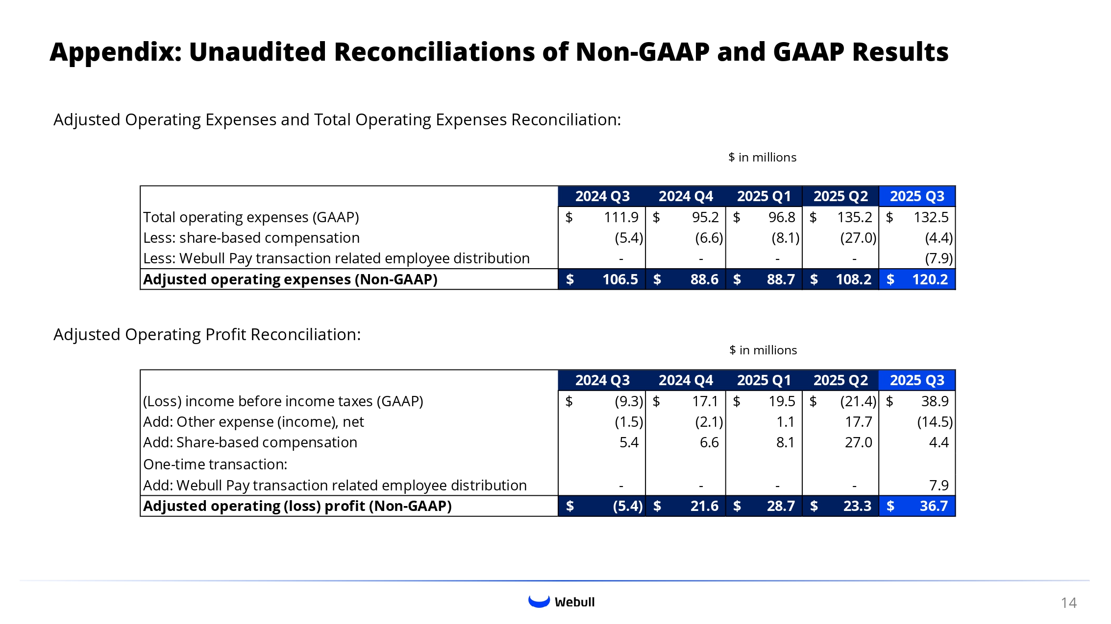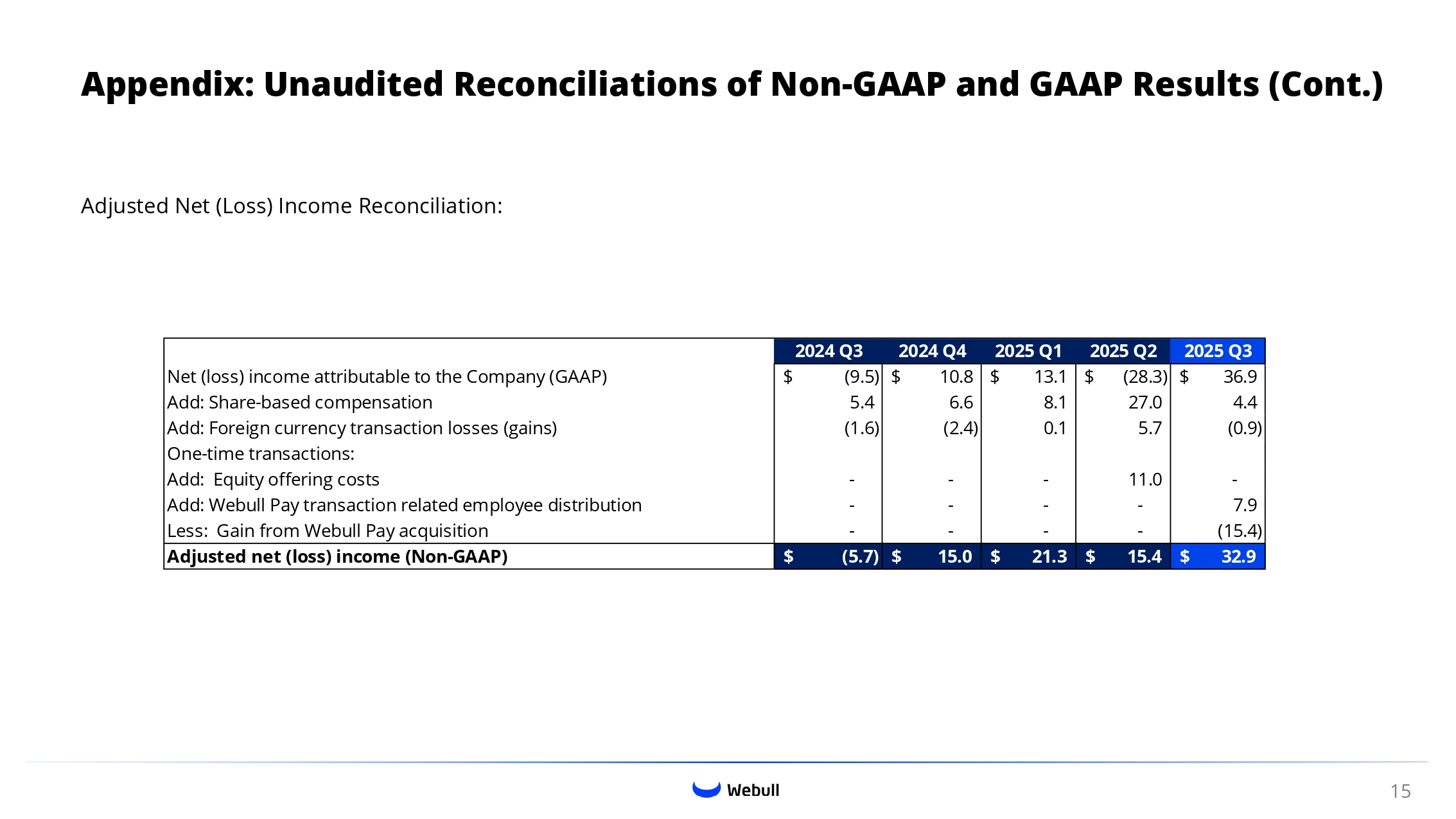 Appendix: Unaudited Reconciliations of Non - GAAP and GAAP Results 14 Adjusted Operating Expenses and Total Operating Expenses Reconciliation: Adjusted Operating Profit Reconciliation: $ in millions $ in millions 2025 Q3 2025 Q2 2025 Q1 2024 Q4 2024 Q3 Total operating expenses (GAAP) Less: share - based compensation Less: Webull Pay transaction related employee distribution $ 132.5 (4.4) (7.9) $ 135.2 (27.0) - $ 96.8 (8.1) - $ 95.2 (6.6) - $ 111.9 (5.4) - $ 120.2 $ 108.2 $ 88.7 $ 88.6 $ 106.5 Adjusted operating expenses (Non - GAAP) 2025 Q3 2025 Q2 2025 Q1 2024 Q4 2024 Q3 $ 38.9 $ (21.4) $ 19.5 $ 17.1 $ (9.3) (Loss) income before income taxes (GAAP) (14.5) 17.7 1.1 (2.1) (1.5) Add: Other expense (income), net 4.4 27.0 8.1 6.6 5.4 Add: Share - based compensation One - time transaction: 7.9 - - - - Add: Webull Pay transaction related employee distribution $ 36.7 $ 23.3 $ 28.7 $ 21.6 $ (5.4) Adjusted operating (loss) profit (Non - GAAP)