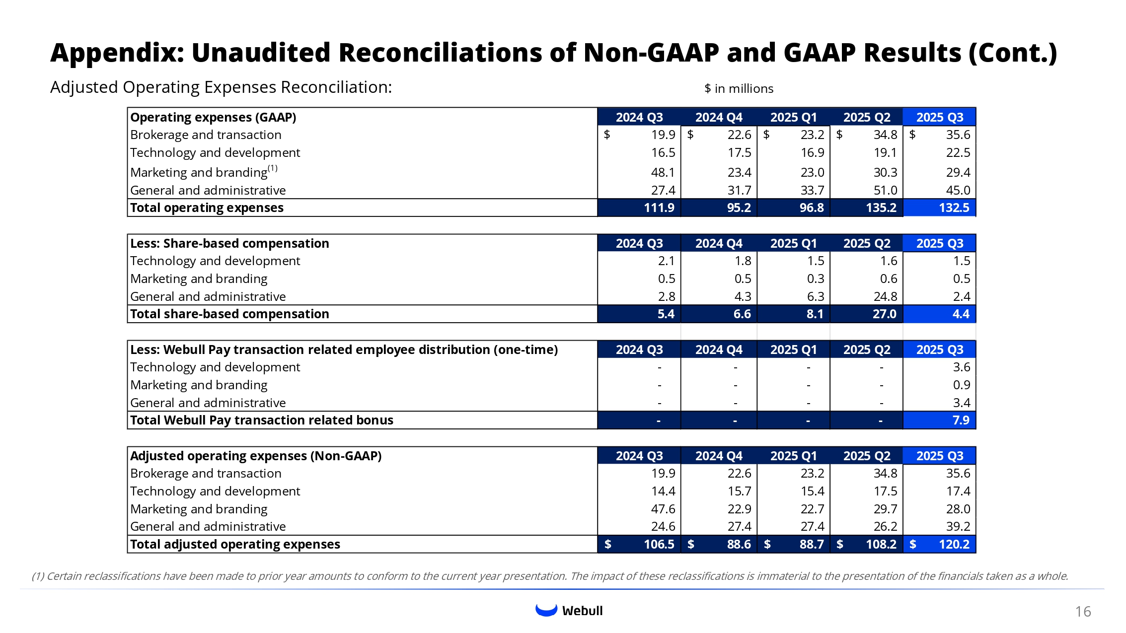 Appendix: Unaudited Reconciliations of Non - GAAP and GAAP Results (Cont.) 15 Adjusted Net (Loss) Income Reconciliation: 2025 Q3 2025 Q2 2025 Q1 2024 Q4 2024 Q3 $ 36.9 $ (28.3) $ 13.1 $ 10.8 $ (9.5) Net (loss) income attributable to the Company (GAAP) 4.4 27.0 8.1 6.6 5.4 Add: Share - based compensation (0.9) 5.7 0.1 (2.4) (1.6) Add: Foreign currency transaction losses (gains) One - time transactions: - 11.0 - - - Add: Equity offering costs 7.9 - - - - Add: Webull Pay transaction related employee distribution (15.4) - - - - Less: Gain from Webull Pay acquisition $ 32.9 $ 15.4 $ 21.3 $ 15.0 $ (5.7) Adjusted net (loss) income (Non - GAAP)