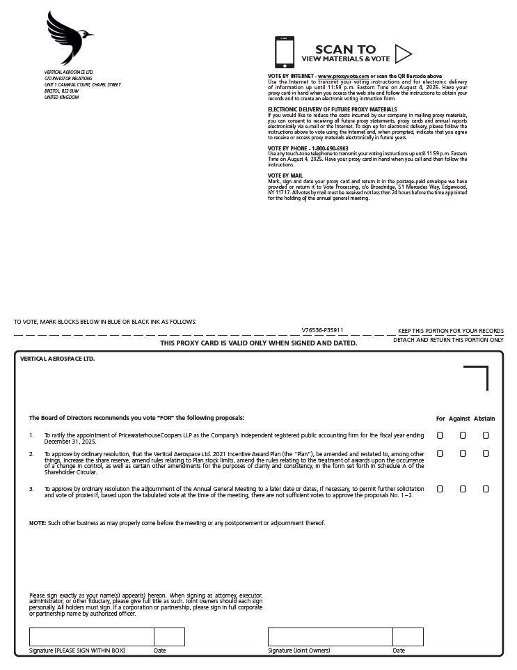 Signature [PLEASE SIGN WITHIN BOX]  Date  Signature (Joint Owners)  Date  TO VOTE, MARK BLOCKS BELOW IN BLUE OR BLACK INK AS FOLLOWS:  KEEP THIS PORTION FOR YOUR RECORDS  DETACH AND RETURN THIS PORTION ONLY  THIS PROXY CARD IS VALID ONLY WHEN SIGNED AND DATED.  V76536-P35911   To ratify the appointment of PricewaterhouseCoopers LLP as the Company’s independent registered public accounting firm for the fiscal year ending December 31, 2025.   To approve by ordinary resolution, that the Vertical Aerospace Ltd. 2021 Incentive Award Plan (the “Plan”), be amended and restated to, among other things, increase the share reserve, amend rules relating to Plan stock limits, amend the rules relating to the treatment of awards upon the occurrence of a change in control, as well as certain other amendments for the purposes of clarity and consistency, in the form set forth in Schedule A of the Shareholder Circular.  3. To approve by ordinary resolution the adjournment of the Annual General Meeting to a later date or dates, if necessary, to permit further solicitation and vote of proxies if, based upon the tabulated vote at the time of the meeting, there are not sufficient votes to approve the proposals No. 1 – 2.  For Against Abstain  ! ! !  ! ! !  VERTICAL AEROSPACE LTD.  The Board of Directors recommends you vote “FOR” the following proposals:  VERTICAL AEROSPACE LTD. C/O INVESTOR RELATIONS  UNIT 1 CAMWAL COURT, CHAPEL STREET BRISTOL, BS2 0UW  UNITED KINGDOM  Please sign exactly as your name(s) appear(s) hereon. When signing as attorney, executor, administrator, or other fiduciary, please give full title as such. Joint owners should each sign personally. All holders must sign. If a corporation or partnership, please sign in full corporate or partnership name by authorized officer.  NOTE: Such other business as may properly come before the meeting or any postponement or adjournment thereof.  ! ! !  VOTE BY INTERNET - www.proxyvote.com or scan the QR Barcode above  Use the Internet to transmit your voting instructions and for electronic delivery of information up until 11:59 p.m. Eastern Time on August 4, 2025. Have your proxy card in hand when you access the web site and follow the instructions to obtain your records and to create an electronic voting instruction form.  ELECTRONIC DELIVERY OF FUTURE PROXY MATERIALS  If you would like to reduce the costs incurred by our company in mailing proxy materials, you can consent to receiving all future proxy statements, proxy cards and annual reports electronically via e-mail or the Internet. To sign up for electronic delivery, please follow the instructions above to vote using the Internet and, when prompted, indicate that you agree to receive or access proxy materials electronically in future years.  VOTE BY PHONE - 1-800-690-6903  Use any touch-tone telephone to transmit your voting instructions up until 11:59 p.m. Eastern Time on August 4, 2025. Have your proxy card in hand when you call and then follow the instructions.  VOTE BY MAIL  Mark, sign and date your proxy card and return it in the postage-paid envelope we have provided or return it to Vote Processing, c/o Broadridge, 51 Mercedes Way, Edgewood, NY 11717. All votes by mail must be received not less than 24 hours before the time appointed for the holding of the annual general meeting.  SCAN TO  VIEW MATERIALS & VOTE  