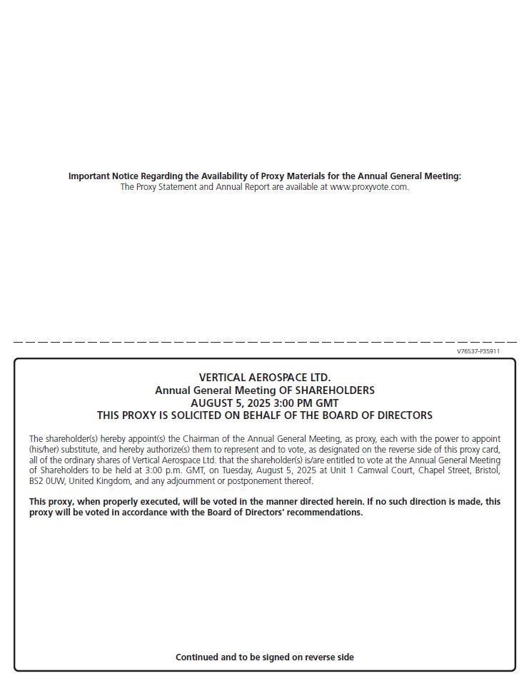 Important Notice Regarding the Availability of Proxy Materials for the Annual General Meeting:  The Proxy Statement and Annual Report are available at www.proxyvote.com.  V76537-P35911  VERTICAL AEROSPACE LTD.  Annual General Meeting OF SHAREHOLDERS AUGUST 5, 2025 3:00 PM GMT  THIS PROXY IS SOLICITED ON BEHALF OF THE BOARD OF DIRECTORS  The shareholder(s) hereby appoint(s) the Chairman of the Annual General Meeting, as proxy, each with the power to appoint (his/her) substitute, and hereby authorize(s) them to represent and to vote, as designated on the reverse side of this proxy card, all of the ordinary shares of Vertical Aerospace Ltd. that the shareholder(s) is/are entitled to vote at the Annual General Meeting of Shareholders to be held at 3:00 p.m. GMT, on Tuesday, August 5, 2025 at Unit 1 Camwal Court, Chapel Street, Bristol, BS2 0UW, United Kingdom, and any adjournment or postponement thereof.  This proxy, when properly executed, will be voted in the manner directed herein. If no such direction is made, this proxy will be voted in accordance with the Board of Directors’ recommendations.  Continued and to be signed on reverse side