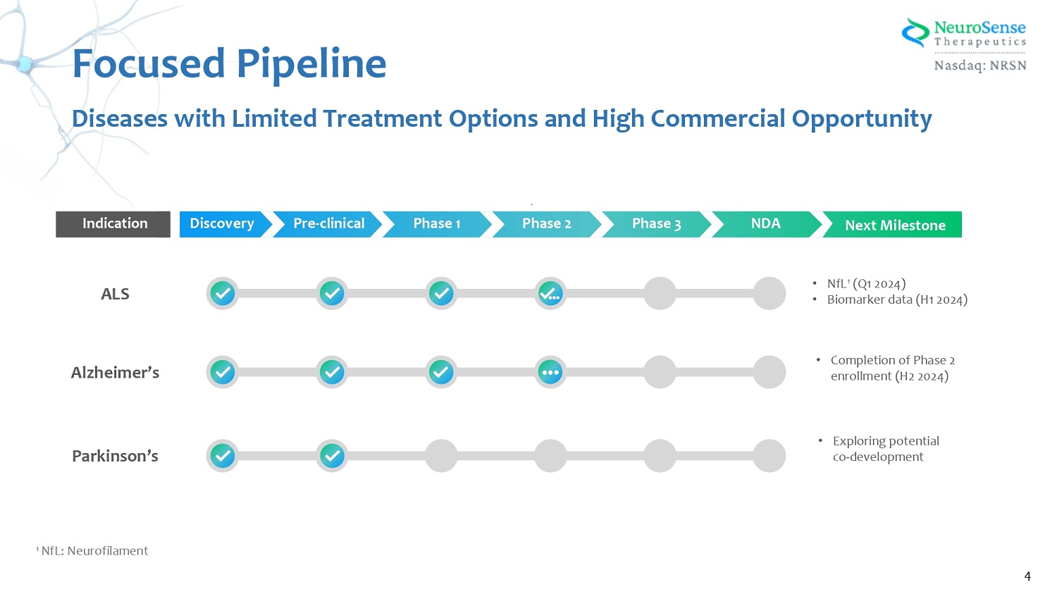 NeuroSense Highlights Developing novel therapies for neurodegenerative diseases of high unmet need Significant top line results from Phase 2b study for ALS 1 Additional catalysts expected: Neurofilament results (Q1 2024) Biomarker results (H1 2024) Existing partnership with big pharma, and fully funded through Q2 2024 1 ALS - Amyotrophic Lateral Sclerosis, also referred to as Lou Gehrig ’ s Disease 3