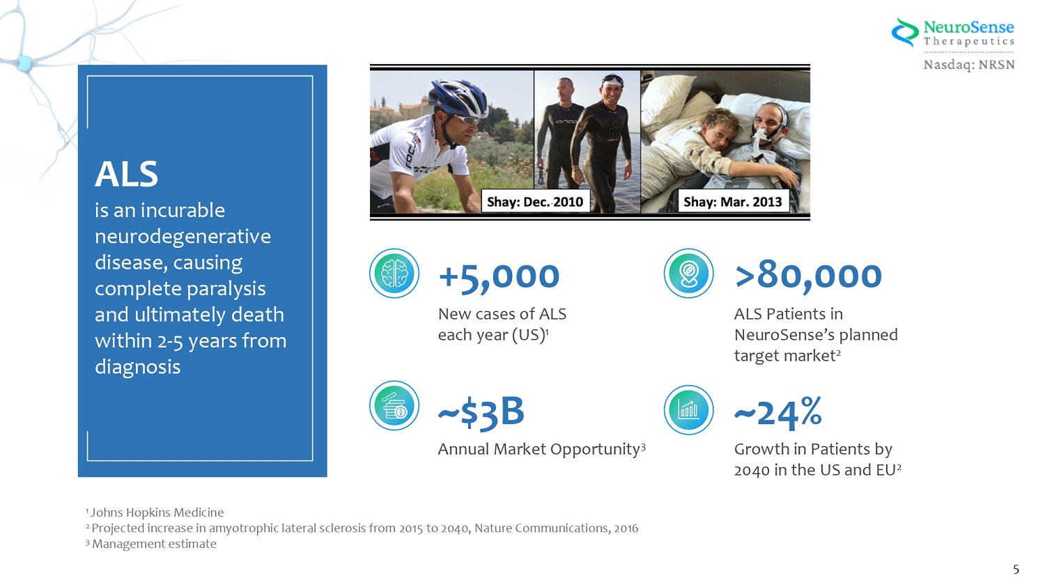 Focused Pipeline Diseases with Limited Treatment Options and High Commercial Opportunity ALS • NfL 1 (Q 1 2024 ) • Biomarker data (H 1 2024 ) Discovery Pre - clinical Phase 1 Phase 2 Phase 3 NDA Indication Next Milestone Parkinson ’ s • Exploring potential co - development Alzheimer ’ s • Completion of Phase 2 enrollment (H 2 2024 ) 1 NfL: Neurofilament 4