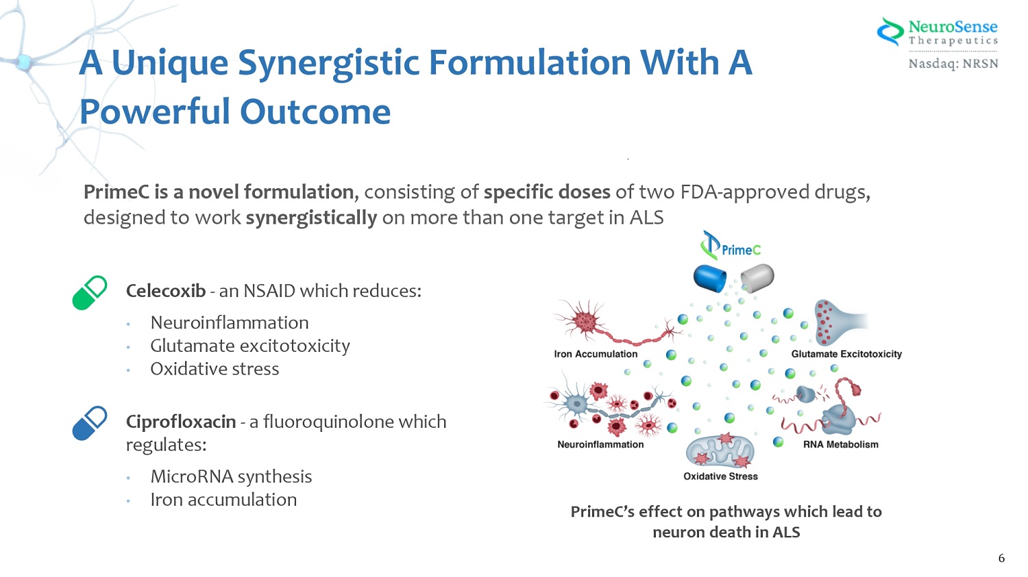 A Unique Synergistic Formulation With A Powerful Outcome Celecoxib - an NSAID which reduces: • Neuroinflammation • Glutamate excitotoxicity • Oxidative stress Ciprofloxacin - a fluoroquinolone which regulates: • MicroRNA synthesis • Iron accumulation PrimeC is a novel formulation , consisting of specific doses of two FDA - approved drugs, designed to work synergistically on more than one target in ALS PrimeC ’ s effect on pathways which lead to neuron death in ALS 6