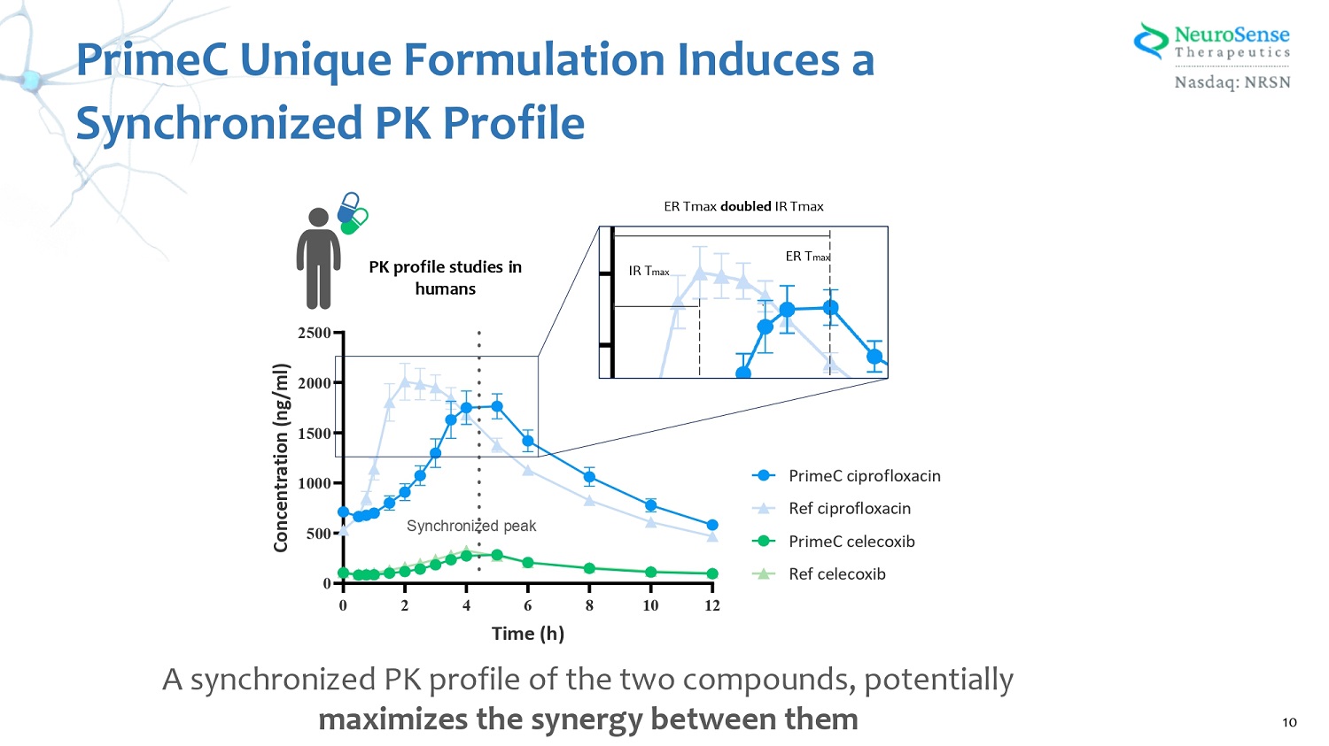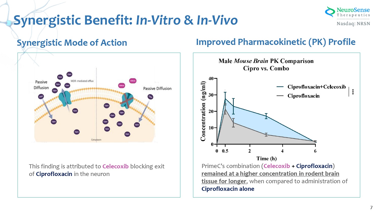 Synergistic Benefit: In - Vitro & In - Vivo This finding is attributed to Celecoxib blocking exit of Ciprofloxacin in the neuron PrimeC ’ s combination ( Celecoxib + Ciprofloxacin ) remained at a higher concentration in rodent brain tissue for longer , when compared to administration of Ciprofloxacin alone *** 7 Synergistic Mode of Action Improved Pharmacokinetic (PK) Profile