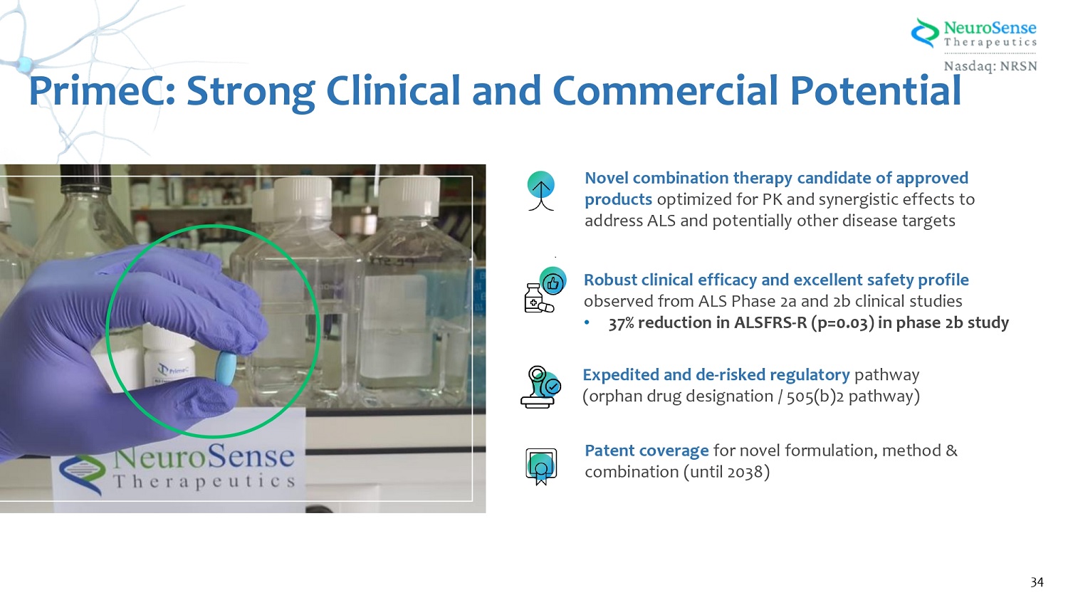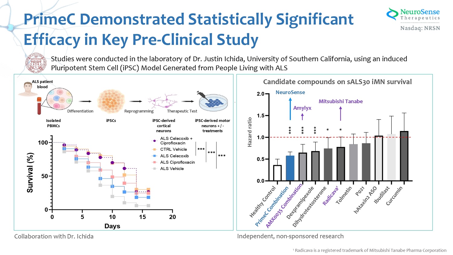 * = p< 0.05 , *** = p< 0.001 PrimeC Demonstrated Statistically Significant Efficacy in Key Pre - Clinical Study * p< 0.05 ***p< 0.001 Studies were conducted in the laboratory of Dr. Justin Ichida, University of Southern California, using an induced Pluripotent Stem Cell ( iPSC) Model Generated from People Living with ALS * *** *** *** * NeuroSense H e a l t h y C o n t r o l ( 5 2 8 0 n = 1 0 0 ) N e u r o S e n s e + 3 µ M ( n = 2 0 0 ) A m y l y x + 3 µ M ( n = 2 0 0 ) D e x p r a m i p e x o l e + 3 µ M ( n = 1 6 8 ) D i h y d r o t e s t o s t e r o n e + 3 µ M ( n = 2 0 0 ) R a d i c a v a + 3 µ M ( n = 1 7 0 ) T o l m e t i n + 3 µ M ( n = 1 6 8 ) P 0 2 1 + 1 µ M ( n = 1 7 0 ) h A t a x i n 2 A S O + 9 µ M ( n = 1 5 0 ) I b u d i l a s t + 3 µ M ( n = 1 2 0 ) C u r c u m i n + 3 µ M ( n = 1 5 0 ) 0.0 0.5 1.0 1.5 2.0 H a z a r d R a t i o Candidate Compounds on sALS30 iMN Survival Amylyx Mitsubishi Tanabe Candidate compounds on sALS 30 iMN survival Hazard ratio NeuroSense 1 Radicava is a registered trademark of Mitsubishi Tanabe Pharma Corporation Independent, non - sponsored research Collaboration with Dr. Ichida Isolated PBMCs iPSCs iPSC - derived motor neurons + / - treatments iPSC - derived cortical neurons Differentiation Reprogramming Therapeutic Test ALS patient blood