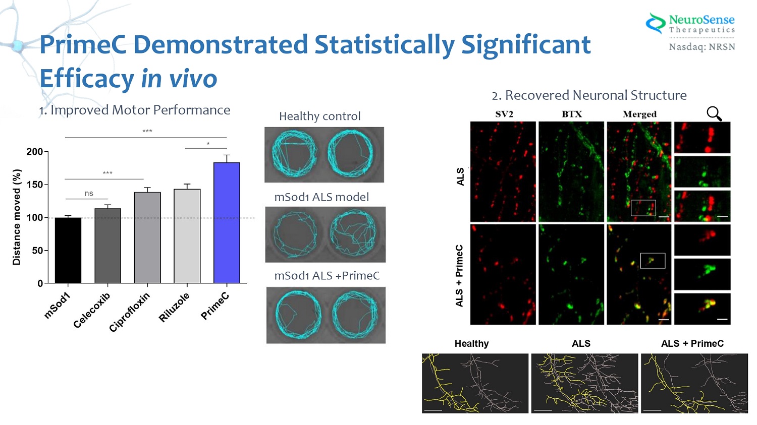 Healthy ALS ALS + PrimeC PrimeC Demonstrated Statistically Significant Efficacy in vivo 1 . Improved Motor Performance Healthy control mSod 1 ALS model mSod 1 ALS +PrimeC 2 . Recovered Neuronal Structure ALS ALS + PrimeC