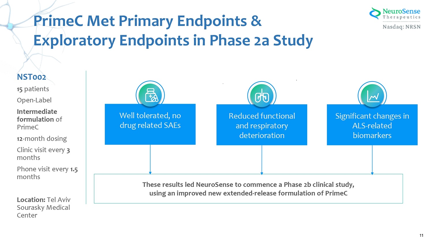 These results led NeuroSense to commence a Phase 2 b clinical study, using an improved new extended - release formulation of PrimeC Significant changes in ALS - related biomarkers Well tolerated, no drug related SAEs Reduced functional and respiratory deterioration NST 002 15 patients Open - Label Intermediate formulation of PrimeC 12 - month dosing Clinic visit every 3 months Phone visit every 1.5 months Location: Tel Aviv Sourasky Medical Center PrimeC Met Primary Endpoints & Exploratory Endpoints in Phase 2 a Study 11