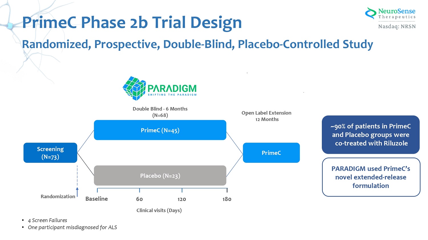 Screening (N= 73 ) PrimeC (N= 45 ) Placebo (N= 23 ) Baseline 180 60 120 Clinical visits (Days) Double Blind - 6 Months (N= 68 ) PrimeC Open Label Extension 12 Months ~ 90 % of patients in PrimeC and Placebo groups were co - treated with Riluzole PARADIGM used P rimeC ’ s novel extended - release formulation PrimeC Phase 2 b Trial Design Randomized, Prospective, Double - Blind, Placebo - Controlled Study • 4 Screen Failures • One participant misdiagnosed for ALS Randomization