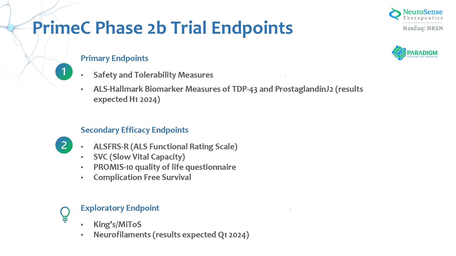Primary Endpoints • Safety and Tolerability Measures • ALS - Hallmark Biomarker Measures of TDP - 43 and ProstaglandinJ 2 (results expected H 1 2024 ) Secondary Efficacy Endpoints • ALSFRS - R (ALS Functional Rating Scale) • SVC (Slow Vital Capacity) • PROMIS - 10 quality of life questionnaire • Complication Free Survival Exploratory Endpoint • King's/ MiToS • Neurofilaments (results expected Q 1 2024 ) PrimeC Phase 2 b Trial Endpoints