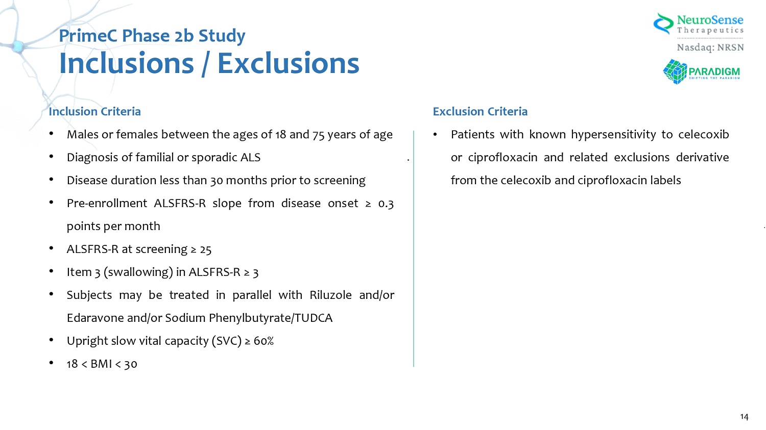 PrimeC Phase 2 b Study Inclusions / Exclusions Inclusion Criteria • Males or females between the ages of 18 and 75 years of age • Diagnosis of familial or sporadic ALS • Disease duration less than 30 months prior to screening • Pre - enrollment ALSFRS - R slope from disease onset ≥ 0 . 3 points per month • ALSFRS - R at screening ≥ 25 • Item 3 (swallowing) in ALSFRS - R ≥ 3 • Subjects may be treated in parallel with Riluzole and/or Edaravone and/or Sodium Phenylbutyrate/TUDCA • Upright slow vital capacity (SVC) ≥ 60 % • 18 < BMI < 30 Exclusion Criteria • Patients with known hypersensitivity to celecoxib or ciprofloxacin and related exclusions derivative from the celecoxib and ciprofloxacin labels 14