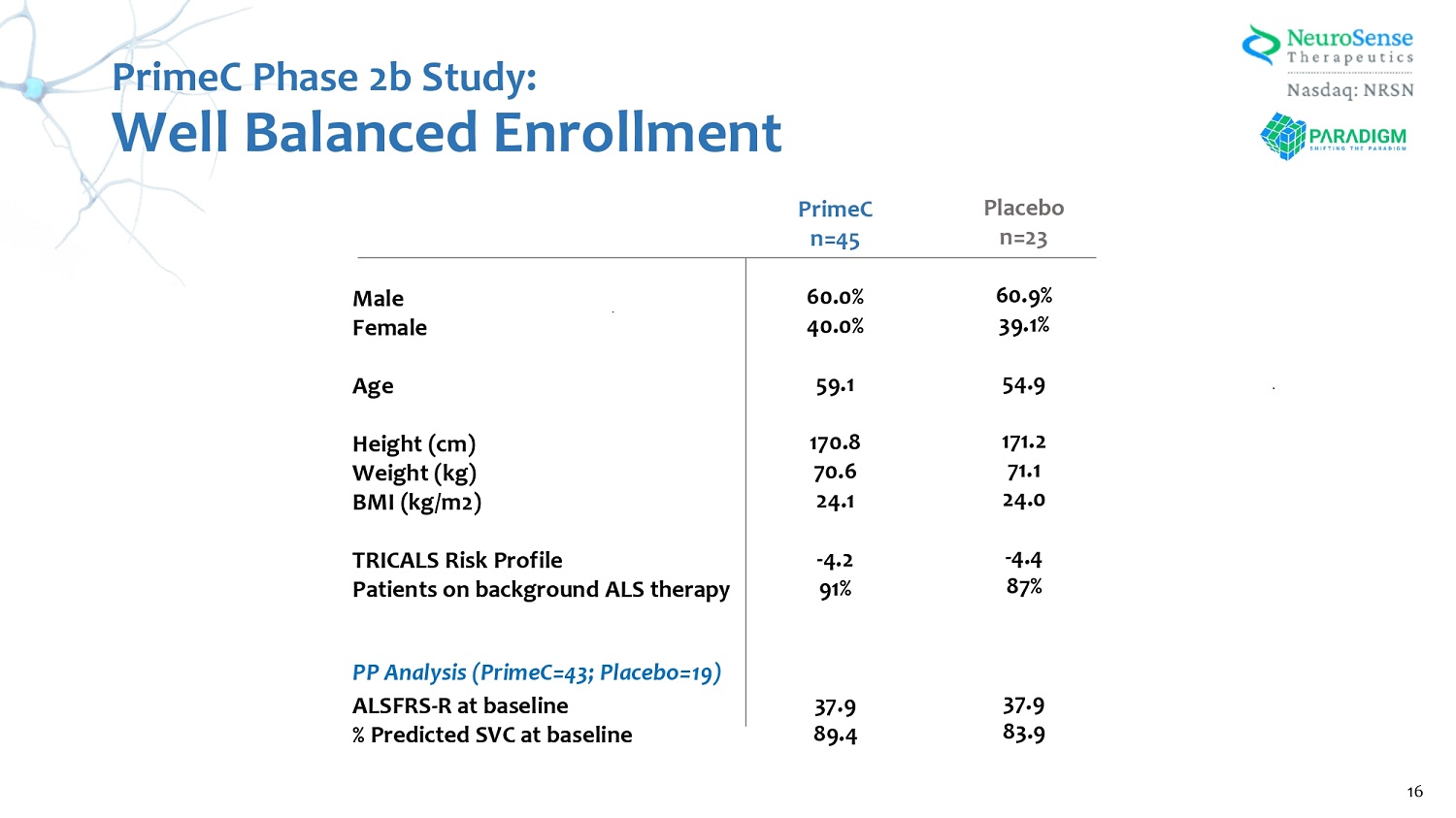 PrimeC Phase 2b Study: Well Balanced Enrollment Male Female Age Height (cm) Weight (kg) BMI (kg/m 2 ) TRICALS Risk Profile Patients on background ALS therapy PP Analysis (PrimeC= 43 ; Placebo= 19 ) ALSFRS - R at baseline % Predicted SVC at baseline Placebo n= 23 60.9 % 39.1 % 54.9 171.2 71.1 24.0 - 4.4 87 % 37.9 83.9 PrimeC n=45 60.0% 40.0% 59.1 170.8 70.6 24.1 - 4.2 91% 37.9 89.4 16