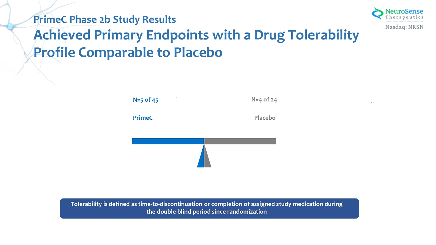 PrimeC Phase 2b Study Results Achieved Primary Endpoints with a D rug T olerability Profile Comparable to Placebo Tolerability is defined as time - to - discontinuation or completion of assigned study medication during the double - blind period since randomization PrimeC Placebo N=5 of 45 N= 4 of 24