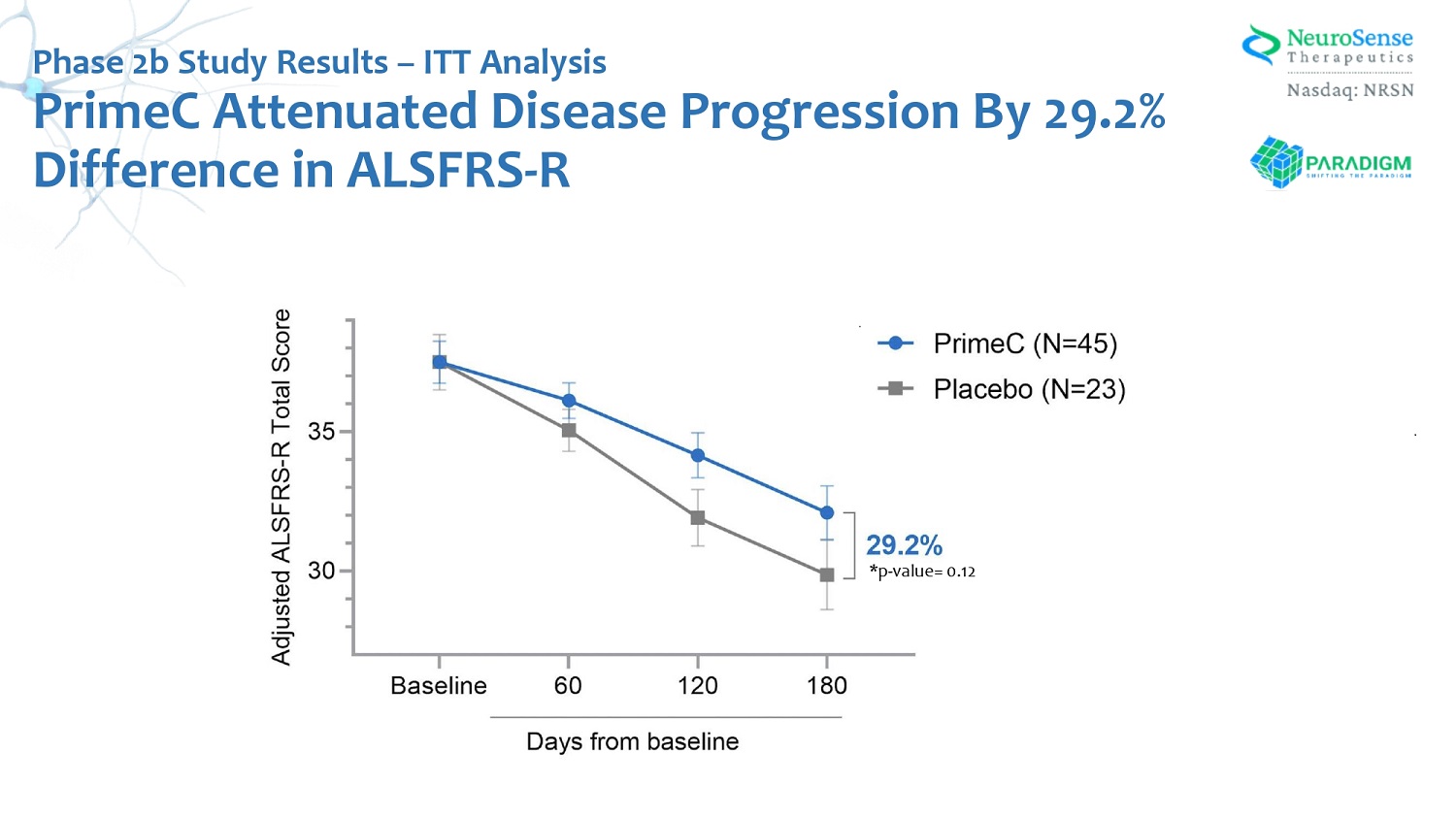 Phase 2 b Study Results – ITT Analysis PrimeC Attenuated Disease Progression By 29.2 % Difference in ALSFRS - R *p - value= 0.12