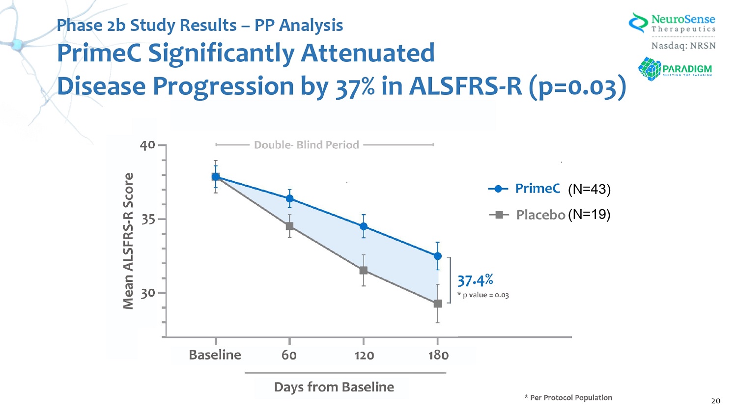 20 (N= 43 ) (N=19) Phase 2 b Study Results – PP Analysis PrimeC Significantly Attenuated Disease Progression by 37 % in ALSFRS - R (p= 0.03 )