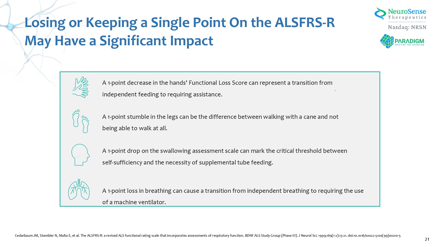 Losing or Keeping a Single Point On the ALSFRS - R May Have a Significant Impact A 1 - point decrease in the hands' Functional Loss Score can represent a transition from independent feeding to requiring assistance. A 1 - point drop on the swallowing assessment scale can mark the critical threshold between self - sufficiency and the necessity of supplemental tube feeding. A 1 - point stumble in the legs can be the difference between walking with a cane and not being able to walk at all. A 1 - point loss in breathing can cause a transition from independent breathing to requiring the use of a machine ventilator. Cedarbaum JM, Stambler N, Malta E, et al. The ALSFRS - R: a revised ALS functional rating scale that incorporates assessments of r espiratory function. BDNF ALS Study Group (Phase III). J Neurol Sci. 1999 ; 169 ( 1 - 2 ): 13 - 21 . doi: 10.1016 /s 0022 - 510 x( 99 ) 00210 - 5 21