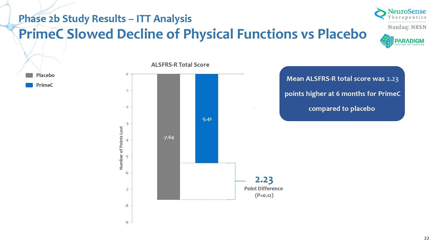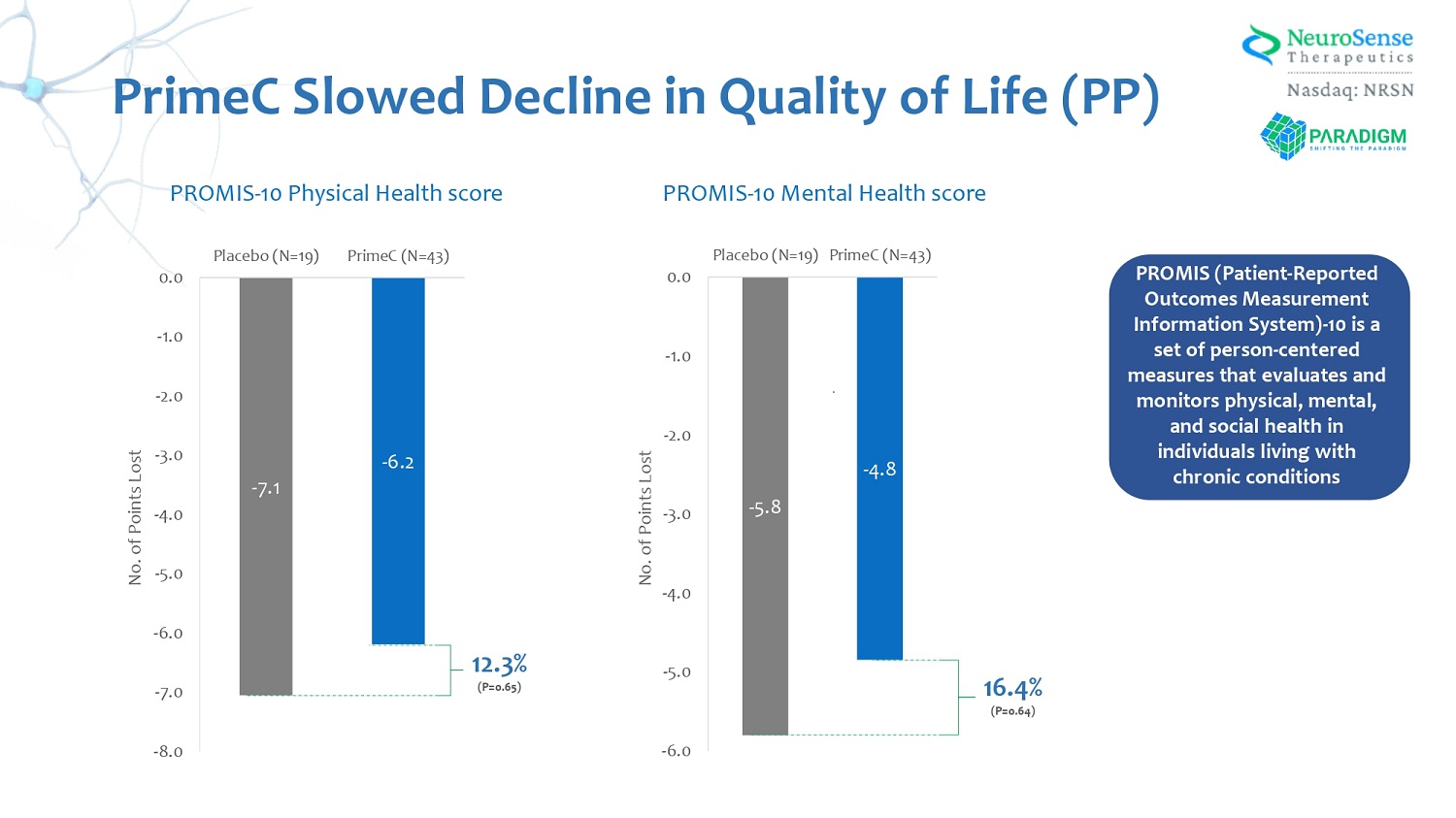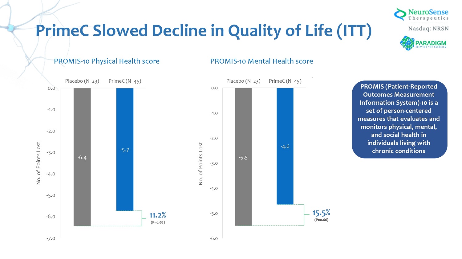 - 6.4 - 5.7 -7.0 -6.0 -5.0 -4.0 -3.0 -2.0 -1.0 0.0 Placebo (N=23) PrimeC (N=45) No. of Points Lost PrimeC Slowed Decline in Quality of Life (ITT) 11.2 % (P= 0.68 ) - 5.5 - 4.6 -6.0 -5.0 -4.0 -3.0 -2.0 -1.0 0.0 Placebo (N=23) PrimeC (N=45) No. of Points Lost PROMIS - 10 Mental Health score PROMIS - 10 Physical Health score 15.5 % (P= 0.66 ) PROMIS (Patient - Reported Outcomes Measurement Information System) - 10 is a set of person - centered measures that evaluates and monitors physical, mental, and social health in individuals living with chronic conditions