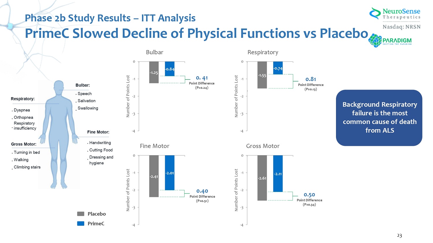 Phase 2 b Study Results – ITT Analysis PrimeC Slowed Decline of Physical Functions vs Placebo Mean ALSFRS - R total score was 2.23 points higher at 6 months for PrimeC compared to placebo . 22 Placebo PrimeC - 7.64 - 5.41 -9 -8 -7 -6 -5 -4 -3 -2 -1 0 Number of Points Lost ALSFRS - R Total Score 2.23 Point Difference (P= 0.12 )