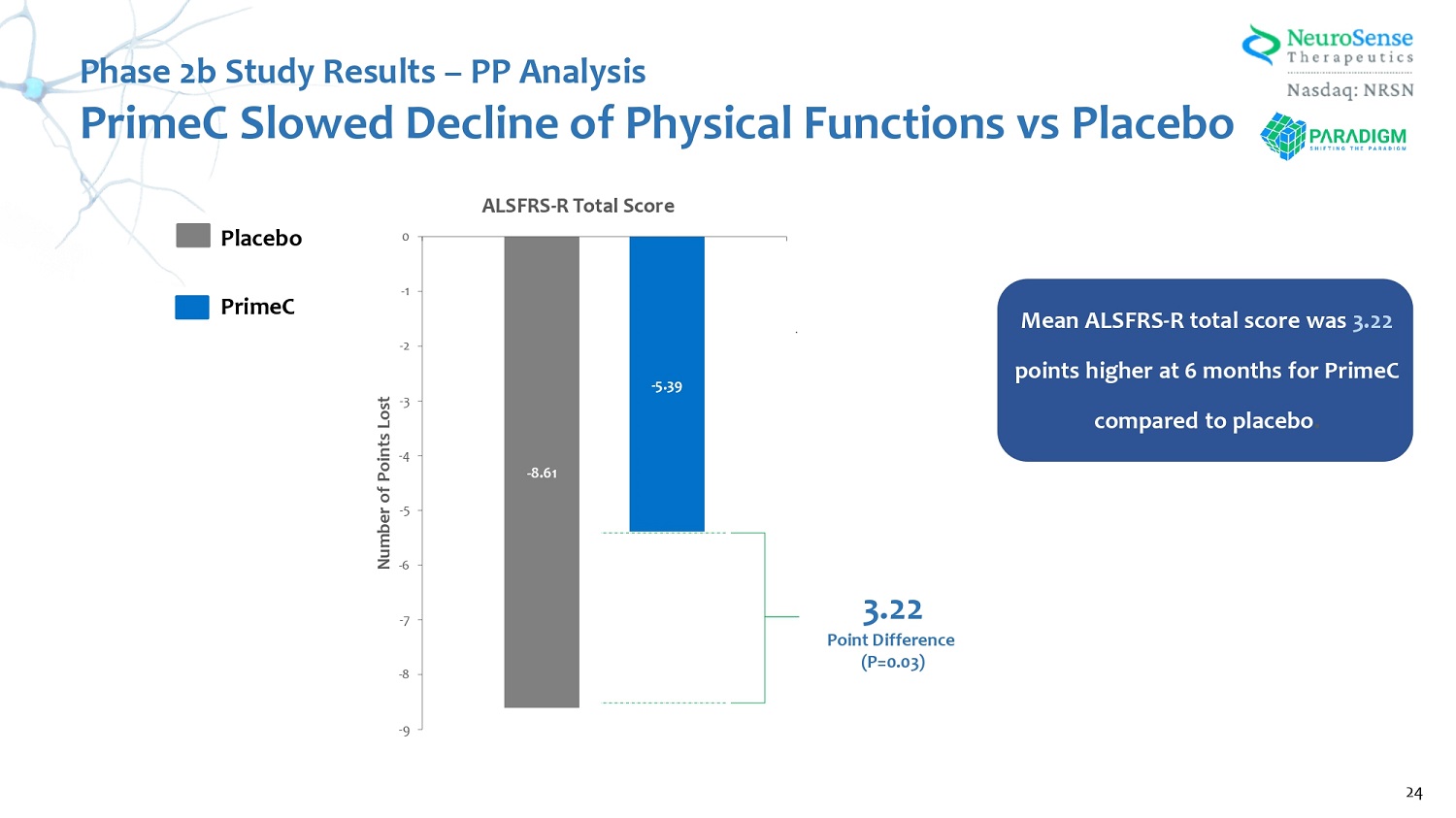 Phase 2 b Study Results – ITT Analysis PrimeC Slowed Decline of Physical Functions vs Placebo 23 Background Respiratory failure is the most common cause of death from ALS - 1.25 - 0.84 -4 -3 -2 -1 0 Number of Points Lost Bulbar 0 . 41 Point Difference (P= 0.24 ) - 1.55 - 0.74 -4 -3 -2 -1 0 Number of Points Lost Respiratory 0.81 Point Difference (P= 0.13 ) - 2.41 - 2.01 -4 -3 -2 -1 0 Number of Points Lost Fine Motor 0.40 Point Difference (P= 0.51 ) - 2.61 - 2.11 -4 -3 -2 -1 0 Number of Points Lost Gross Motor 0.50 Point Difference (P= 0.34 ) Placebo PrimeC Bulbar: Speech Salivation Swallowing Respiratory: Dyspnea Orthopnea Respiratory insufficiency Fine Motor: Handwriting Cutting Food Dressing and hygiene Gross Motor: Turning in bed Walking Climbing stairs