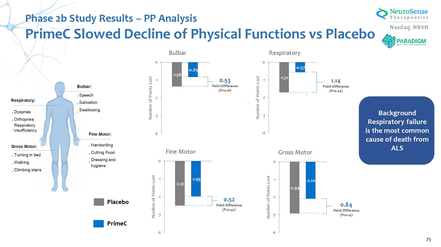 Phase 2 b Study Results – PP Analysis PrimeC Slowed Decline of Physical Functions vs Placebo - 8.61 - 5.39 -9 -8 -7 -6 -5 -4 -3 -2 -1 0 Number of Points Lost ALSFRS - R Total Score 3.22 Point Difference (P=0.03) Mean ALSFRS - R total score was 3.22 points higher at 6 months for PrimeC compared to placebo . Placebo PrimeC 24